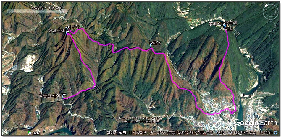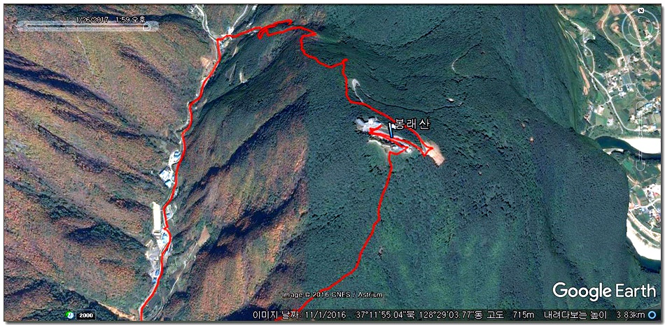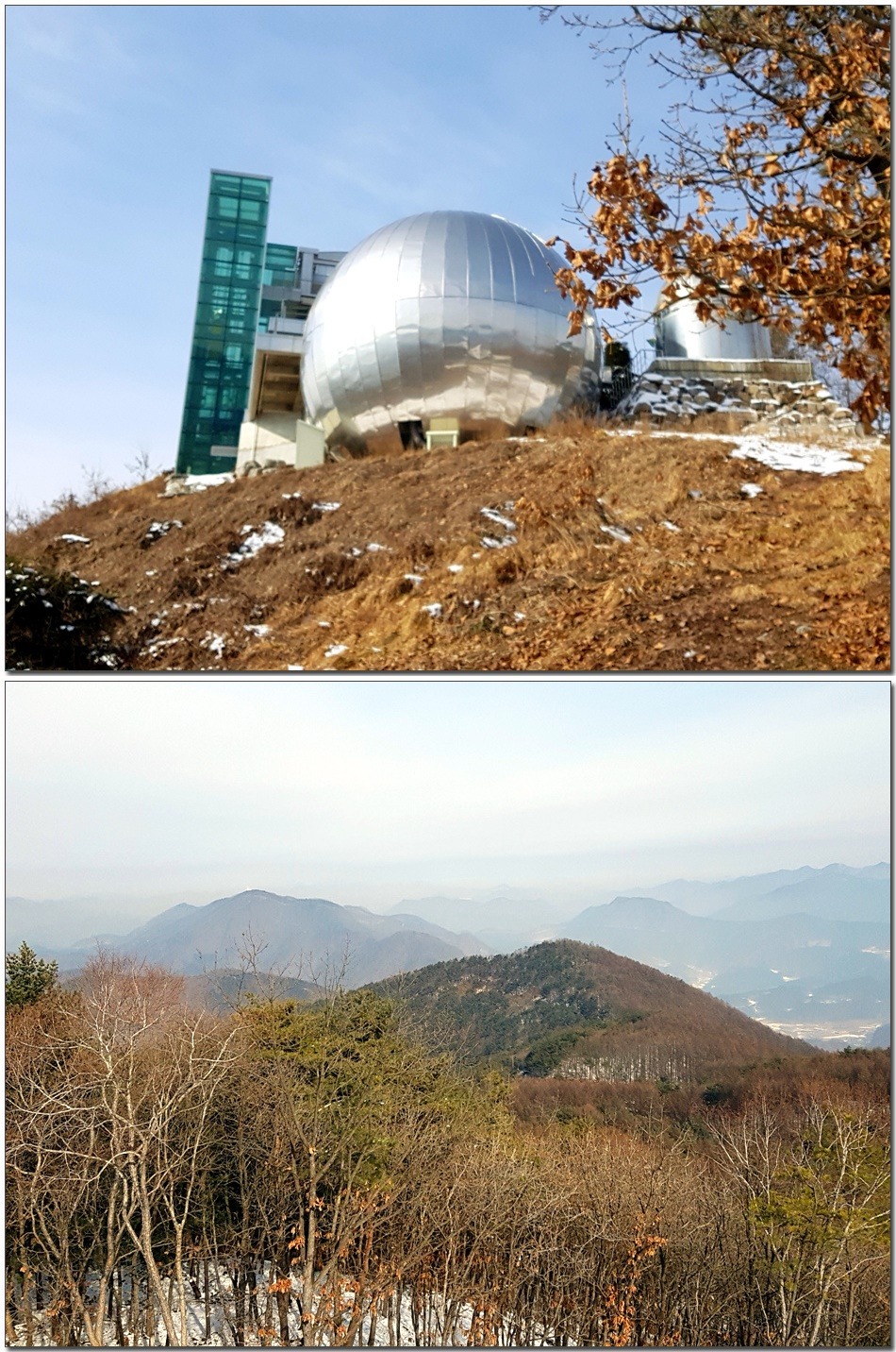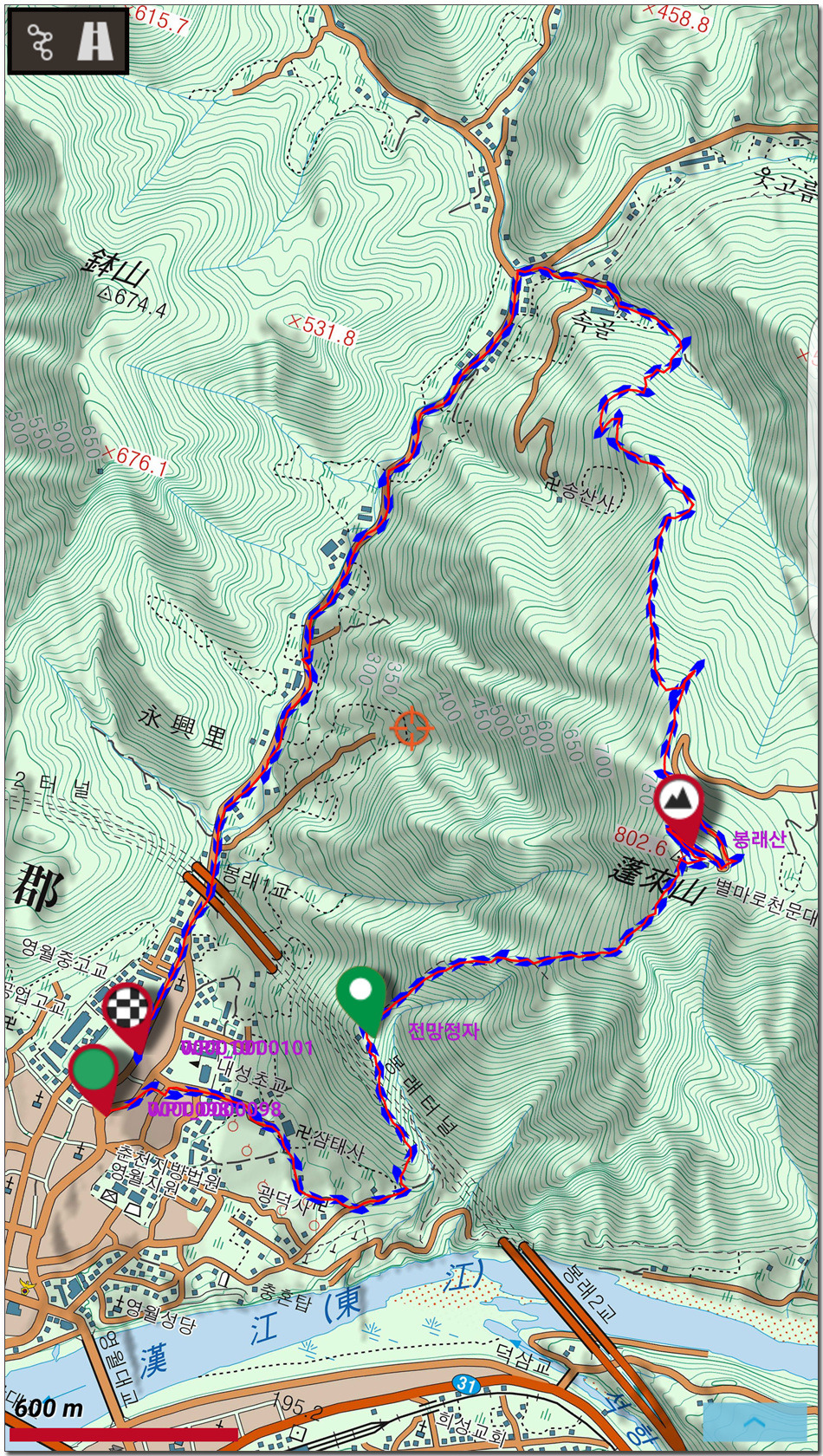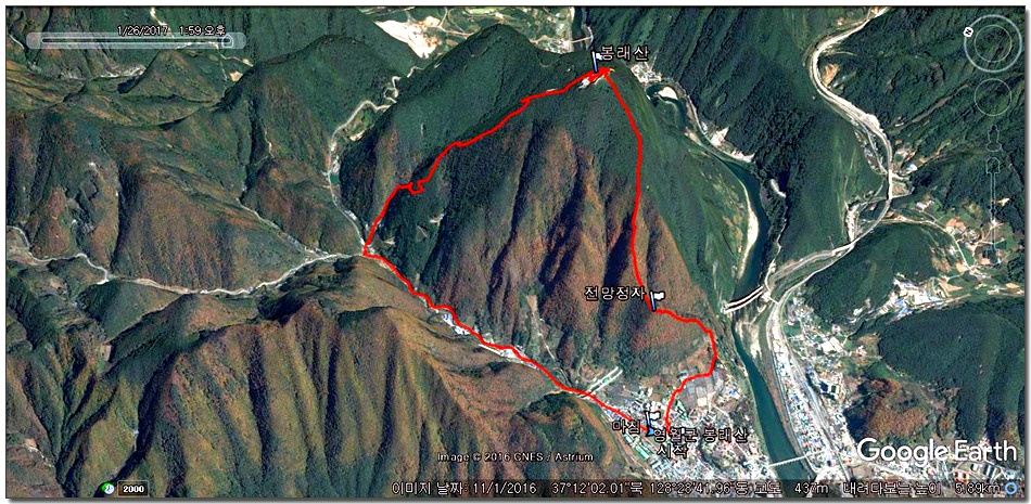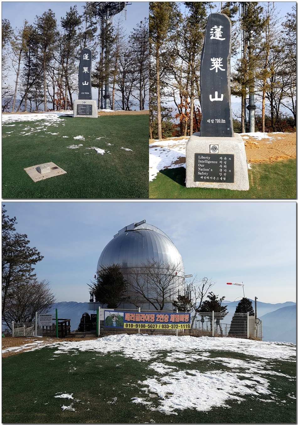 2017.01.26.목요일(맑음)(바람잔잔함) 산행시작~~09시 35분 [영월공고입구 시작] 산행마침~~13시 57분 [영월공고입구 마침] 산행시간~~04시간22분[이동거리 08.05km][함께한사람=뚜벅이 새마포산악회이용] [이시간은 답사 사진촬영과 휴식시간 포함이오니 개인의 산행 실력으로 달라질수 있습니다.]제 1252회 각산 1376[山]봉 답사.~~산행 코스~~ *영월공고입구 시작[09시35분]=전망대(10시18분)=봉래산(11시29분)=영흥3리(속골)(13시21분)=영월공고입구(13시57분)마침*♣봉래산(798.5m)속골 능선걷기♣ ♣봉래산(798.5m)별마로천문대은? 봉래산은 영월읍 영월의 주산으로 시가지 동쪽에 위치하며, 멀리 가리왕산에서 발원하는 물줄기가 천렵터로 유명한 어라연계곡을 거쳐 영월에 이르러 동강을 이루며 산밑을 흐른다. 강변에는 금강정과 낙화암이라는 정자가 있다. 낙화암은 단종이 죽은 뒤 그를 모시던 시녀들이 동강 절벽에서 꽃잎처럼 떨어져 죽었다는 전설이 전한다. 정상에는 별마로 천문대와 페러글라이더 활공장이 있어 많은 관객들이 찾는 산으로 예로부터 봉래채운(蓬萊彩雲)이라하여 영월팔 경중에 하나이기도 하다.봉래산(蓬萊山 799.8m)은 강원도 영월군 영월읍의 동북간을 가로지르는 영월의 주산으로 정상에는 별마로 천문대와 패러글라이더 활공장이 있다. 봉래산 정상에서 서쪽으로 영월읍 시내를 보면 평창과 정선을 거쳐 흘러온 동강과 주천에서 흘러온 서강이 영월에서 합수되어 단양과 충주를 거쳐 남한강에 이른다. ♣성삼문의 시조에 나오는 봉래산이다. 이몸이 죽어가서 무엇이 될꼬하니 봉래산 제일봉에 낙락장송 되어이셔 백설이 만건곤 할때 독야청청하리라아래 지도을 클릭하시면 크게 확인할수 있읍니다.