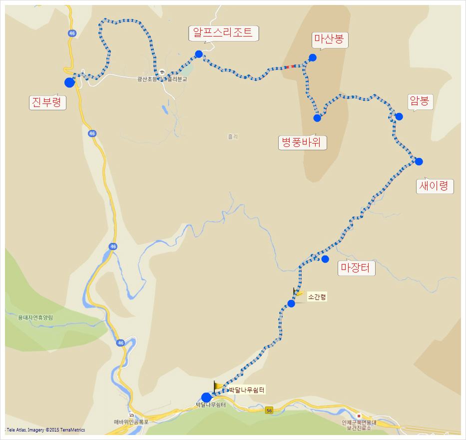 3. 산행코스 : 진부령~알프스스키장~마산봉~병풍바위~암봉~새이령~마장터~소간령~창암~박달나무쉽터