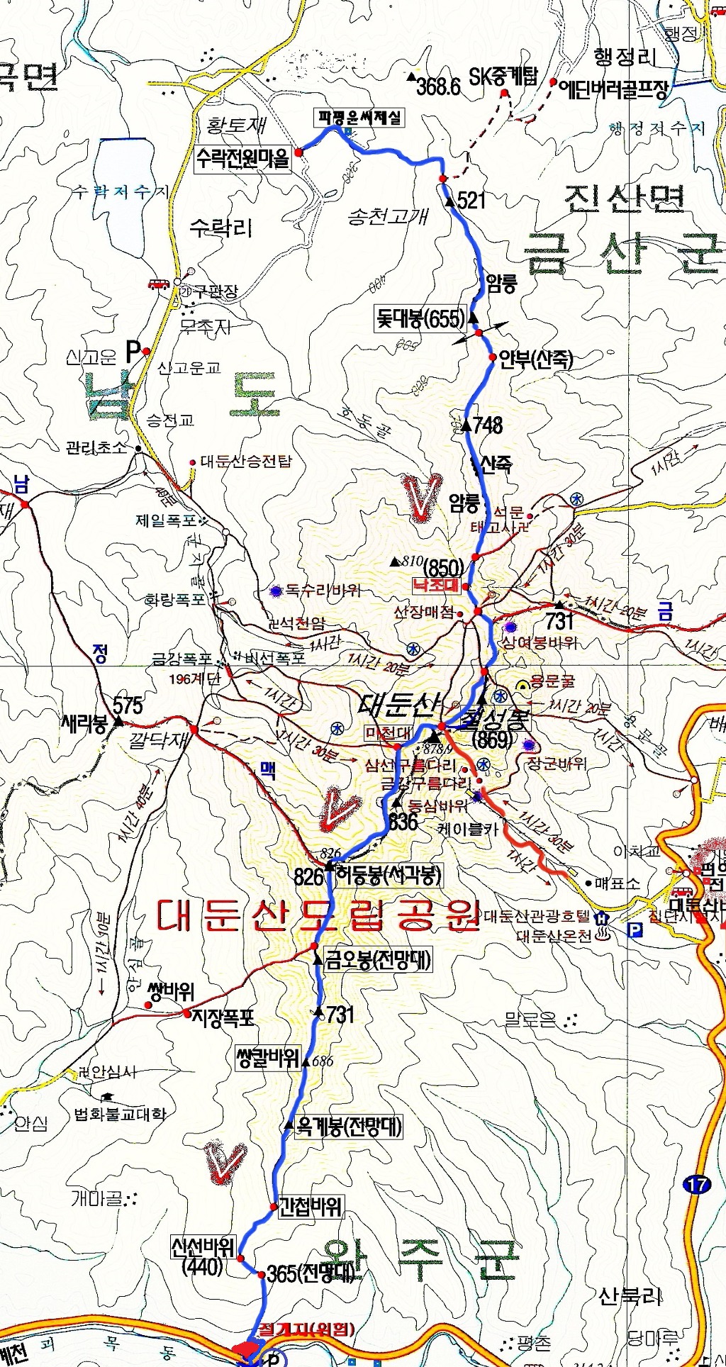 3. 산행코스 : 수락전원마을>돛대봉>낙조대>칠성봉>마천대>서각봉>금오봉>옥계천)