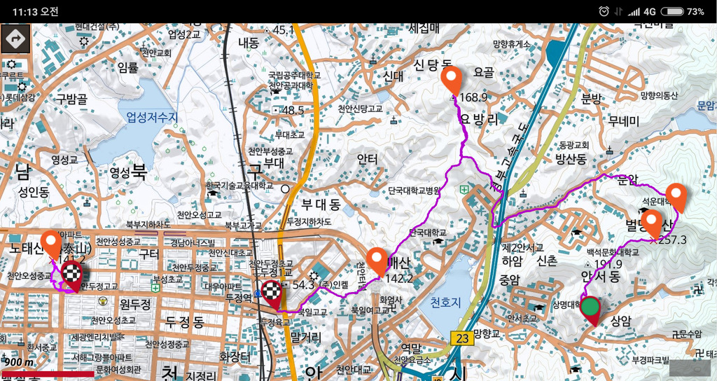 - 산행코스 : 안서대림2차아파트(버스정류장) – 벌명당산 – 왕자산 – 단국대학교 병원 – 국사봉 – 큰매산 – 두정역 – 버스로 이동 – 대우아파트(버스정류장) – 노태산(왕복) (나 홀로 산행)