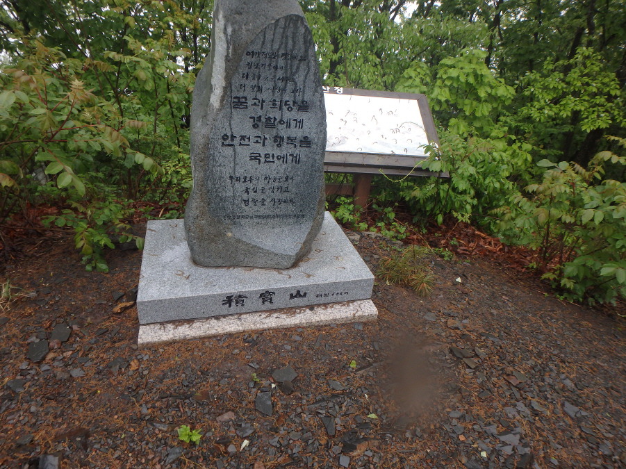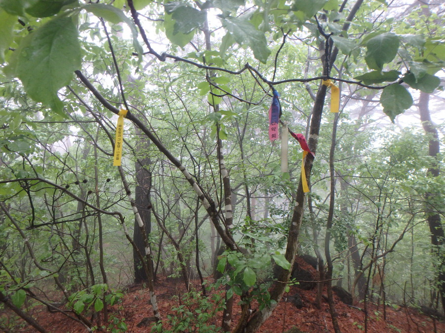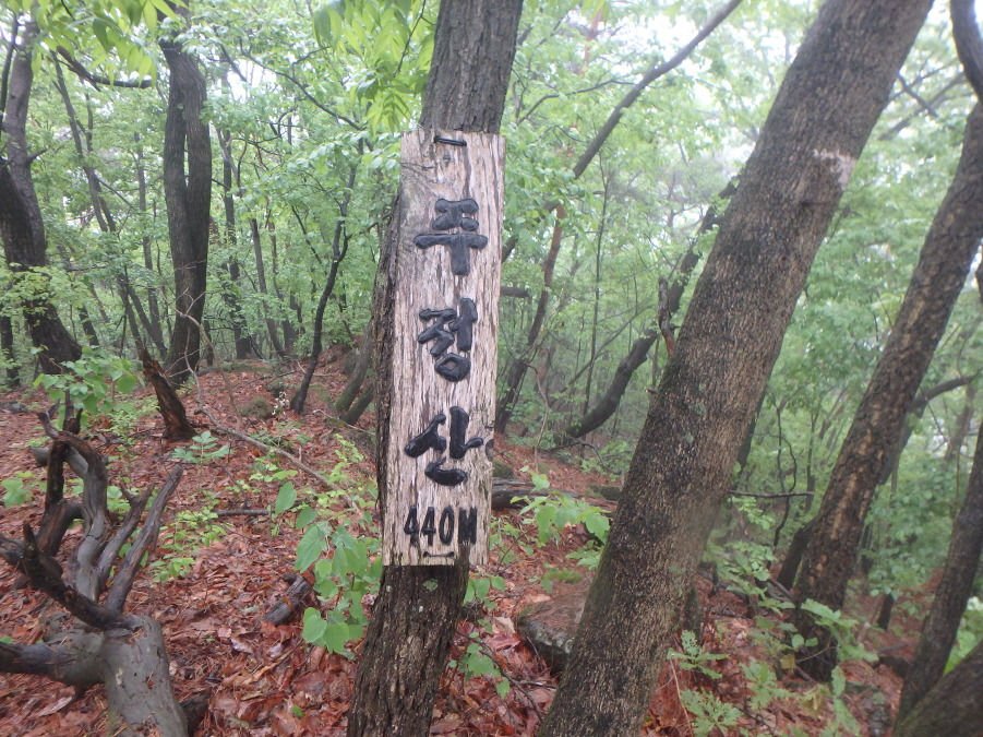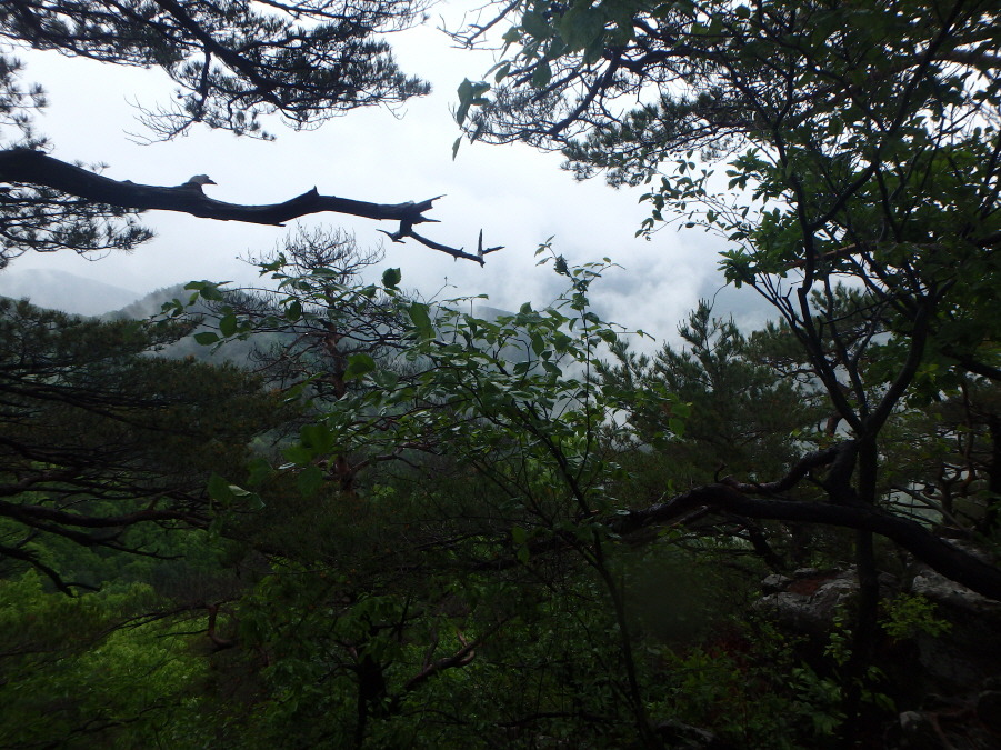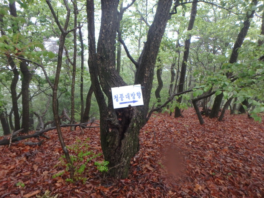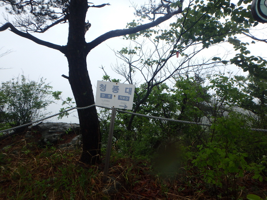 (11;08)인증사진 남기고 정상 출발, 청풍대 방향으로 내리막길을 내려간다. 충청도 산답게 (11;23) 바위봉을 넘어서 (11;27)조망 즐기고 암릉길로 진행하여 바위봉을 넘고(11;28)이정표(경찰학교1.3km/적보산0.6km) 지나면서 (11;28) 청풍대 표지판(연못1.014m/적보산840m)을 만나 비에 젖은 바위 암릉길을 조심스럽게 내려선다. 바위 낭떠러지에서 우측으로 우회하여 다시 좌측으로 바위틈을 비집고 능선에 붙어 다시 암릉길로 진행하다가(11;40)함평문씨와 그부인 합장묘지를 지나면서 암릉은 끝난다.