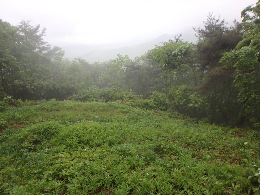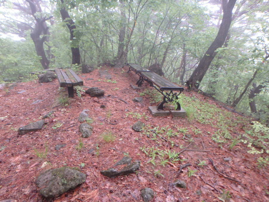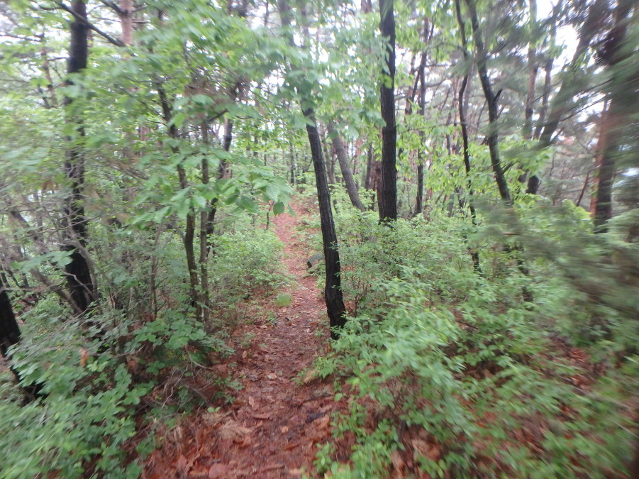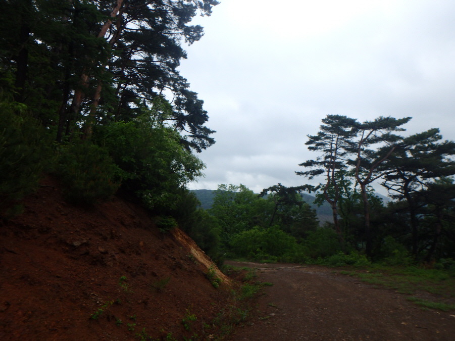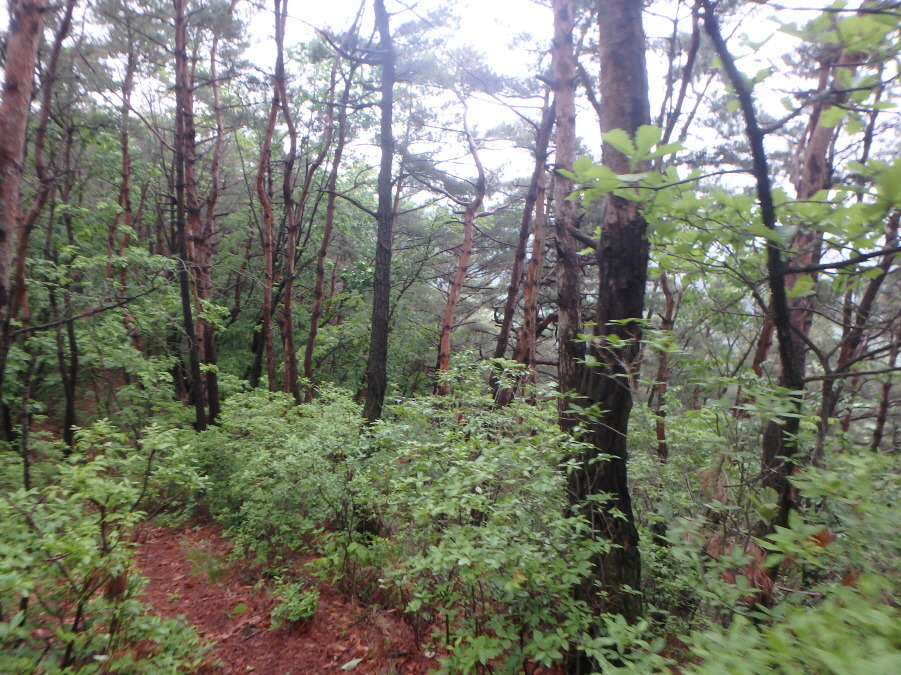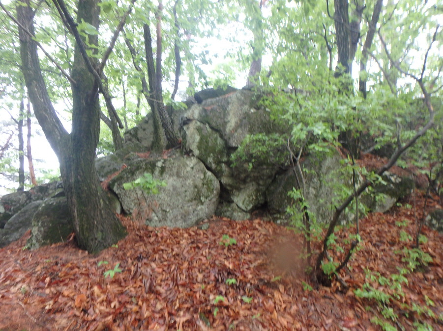 (11;08)인증사진 남기고 정상 출발, 청풍대 방향으로 내리막길을 내려간다. 충청도 산답게 (11;23) 바위봉을 넘어서 (11;27)조망 즐기고 암릉길로 진행하여 바위봉을 넘고(11;28)이정표(경찰학교1.3km/적보산0.6km) 지나면서 (11;28) 청풍대 표지판(연못1.014m/적보산840m)을 만나 비에 젖은 바위 암릉길을 조심스럽게 내려선다. 바위 낭떠러지에서 우측으로 우회하여 다시 좌측으로 바위틈을 비집고 능선에 붙어 다시 암릉길로 진행하다가(11;40)함평문씨와 그부인 합장묘지를 지나면서 암릉은 끝난다.