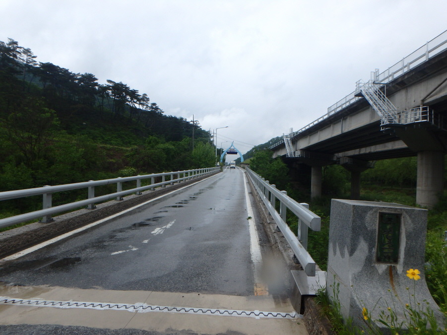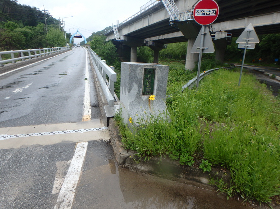 12;10 주정소교에서 바라본 아치형 선전탑 좌측임도가 주정산 들머리입니다.(반대편 도로따라 오산마을로 가도 되지만 짧은 길입니다.)