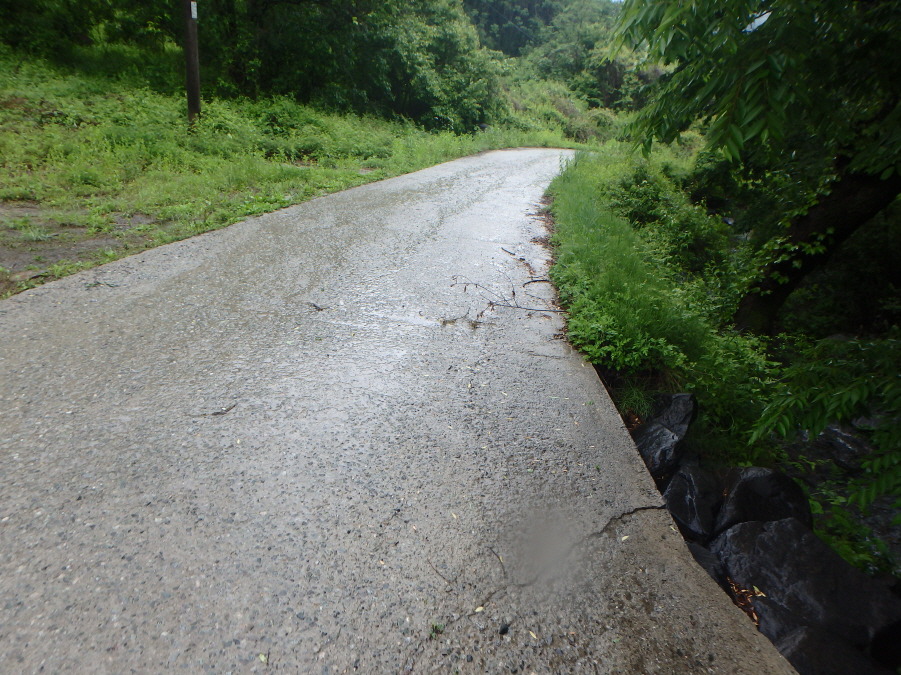 희미한 능선길 급경사 내림길 내려 능선 갈림3거리에서 좌측능선을 타고 별장 같은 전원주택 입구 다리골 콘크리트 포장도로에 내려선다.[2.7km][52분]