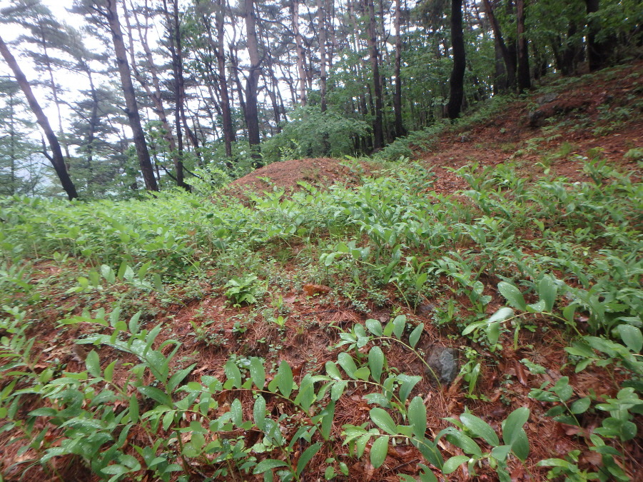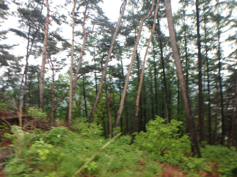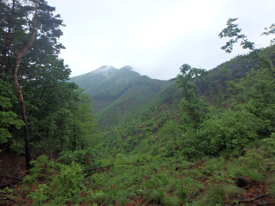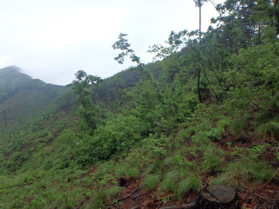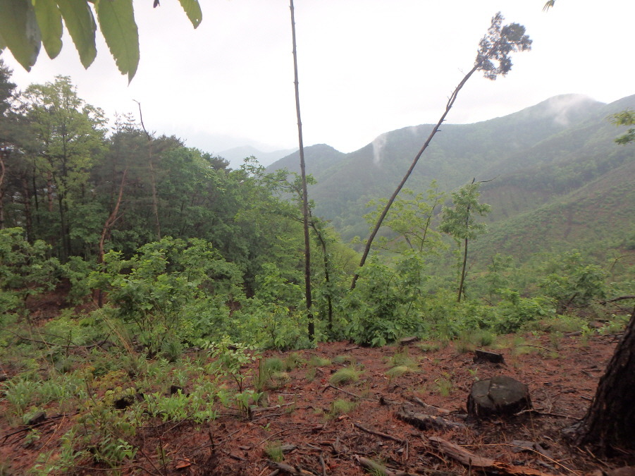 임도 건너 다시 첩푸산을 향한 산길에 진입한다. (10;27) 묵묘1기를 지나고(10;13) 매화식당에서 세운 이정표(적보산1.4km)를 지난다. (10;35)오름길에 좌측으로 조망이 터져 잠시 조망즐긴다. 청아한 숲길이다.