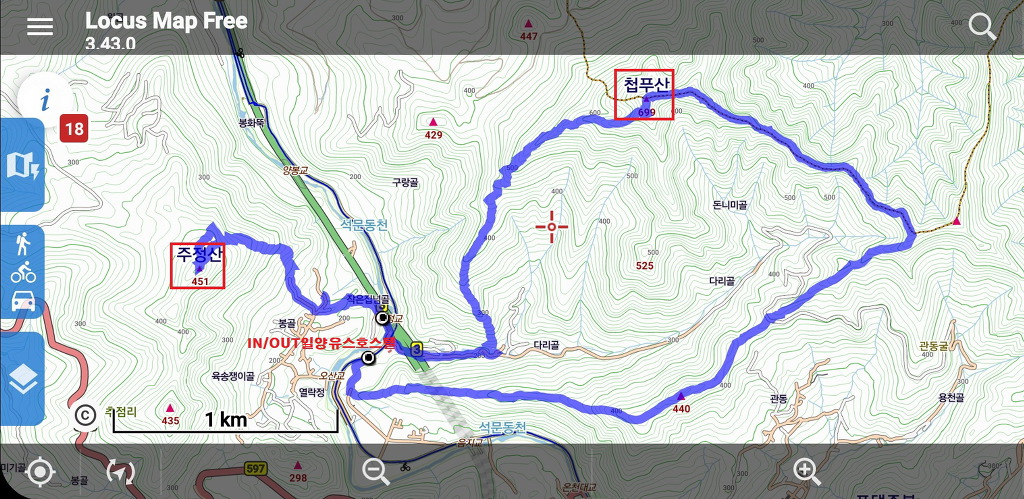 3. 산행코스 : 상모면 일양 유스 호스텔~물탕골 갈림길~수안보 갈림길~임도정자~북봉~첩푸산~청풍대~남릉 개척길~다릿골~유스 호스텔(원점)~오산마을~주정산왕복 ~오산마을~유스호스텔