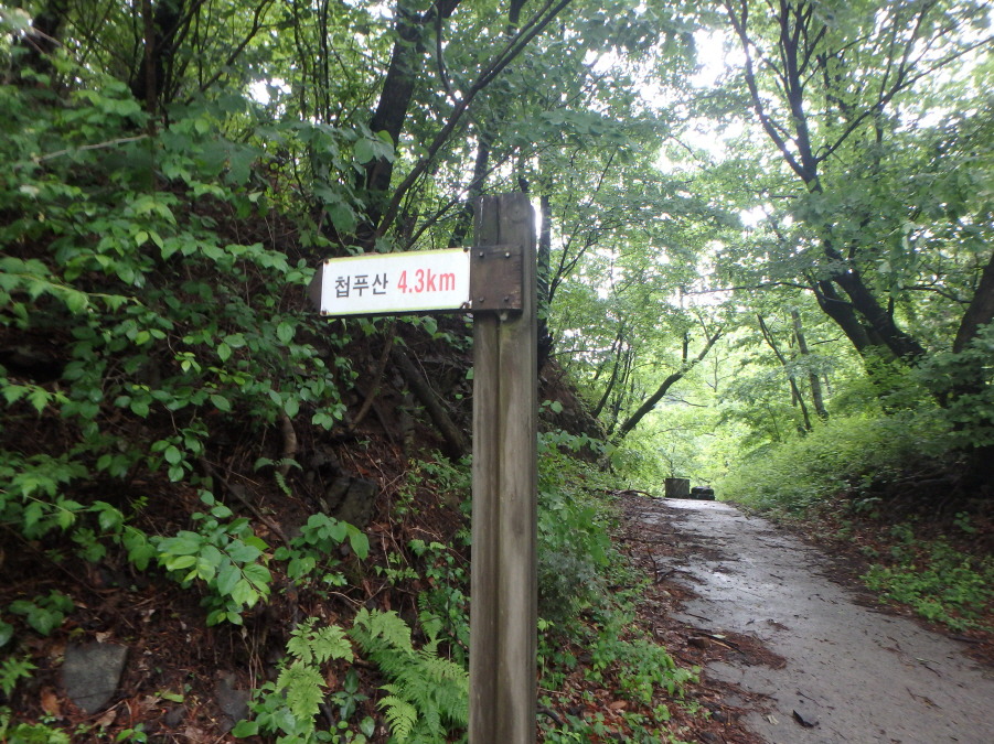 초반의 완만한 오름길 오르니 (09;46)등로 좌측 유스호스텔 경계 철조망 울타리를 끼고 오른다. (10;10) 픽스로프 매여 있는 원형목책계단을 오른다. (10;12) 거의 평지길 같은 등산로가 계속된다. (10;18)관동마을(귓골) 갈림이정표(첩푸산2.4km/관동마을귓골0.6km/온천리1.3km)지나고 (10;20) 임도 공터다.[2.3km][45분]