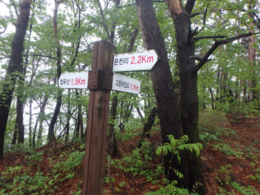(10;37)3거리이정표(첩푸산1.5km/고운리임도1.1km/온천리2.2km)에서 좌향 이정표(첩푸산1.5km)방향 다시 부드러운 육산 능선길 이어간다.
