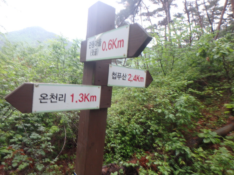 (10;18)관동마을(귓골) 갈림이정표(첩푸산2.4km/관동마을귓골0.6km/온천리1.3km)입니다.