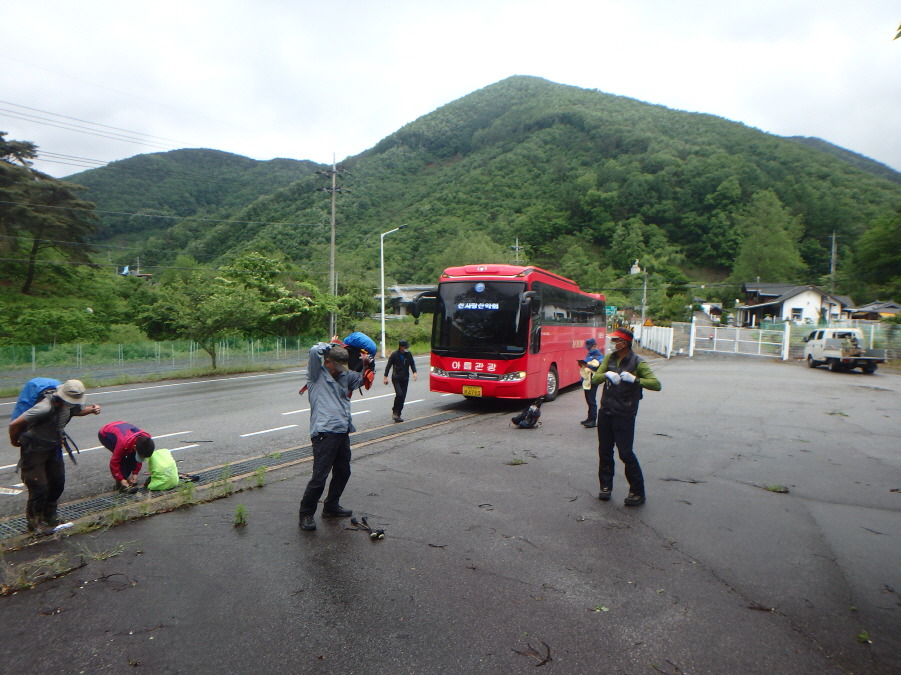 개울에 가서 알탕을 할까하다가 B.C코스팀들이 수안보에 있어 산악회 버스 차안이 한가하고 비가 언제 또 올지도 모르겠어 차안에서 수건에 물 묻혀 대충 머리부터 몸통 닦고 새옷 갈아 입습니다.