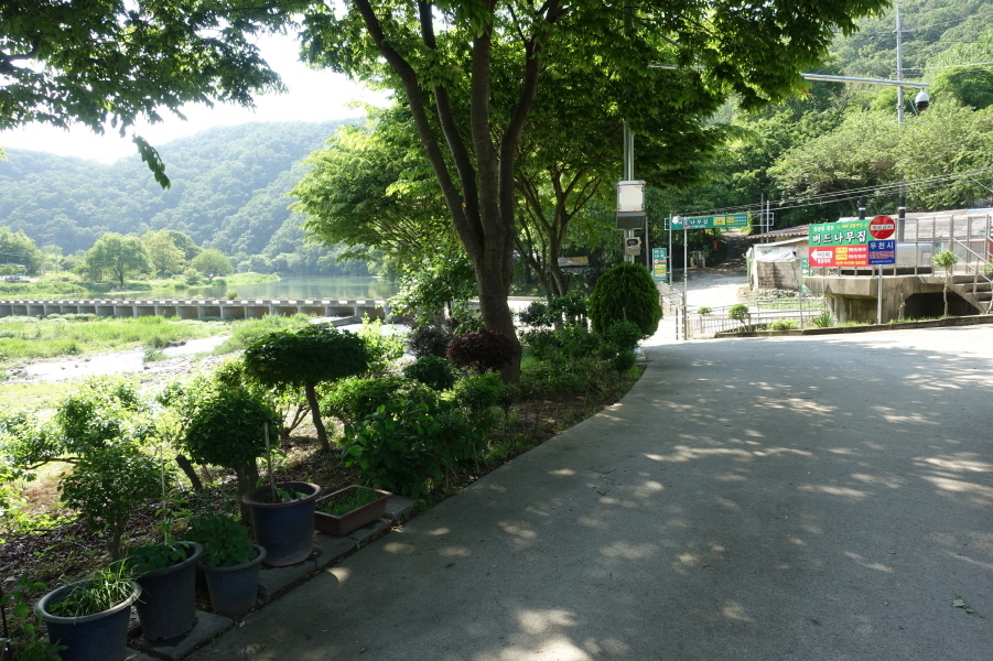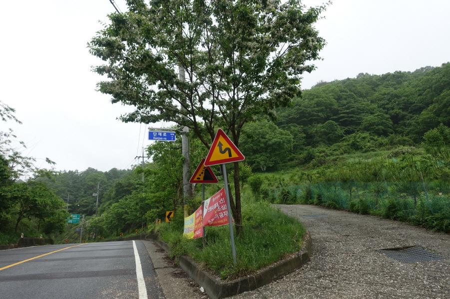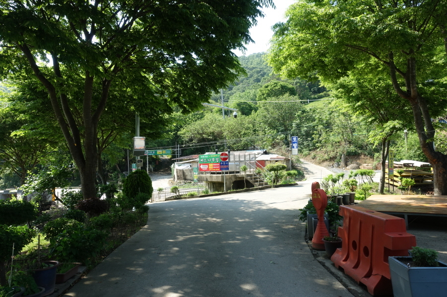 (cf.우측으로 250미터를 가면 청소년수련마을 버스종점이다. 대전역 동광장에서 낭월차고지를 오가는 30번 버스가 정차하는 곳이다. 대부분 이곳에서 산행을 종료하지만)침산과 만성산을 목표로 좌측으로 도로따라 간다. 통상 만성산과 침산은 청소년 수련원 갈림길에서 샛고개로 가서 진행하지만 그럴경우 유동천을 비가와 물이 불어 등산화 벗고 징검다리로 건너야 될지도 몰라 수련교를 건너 진행한다.