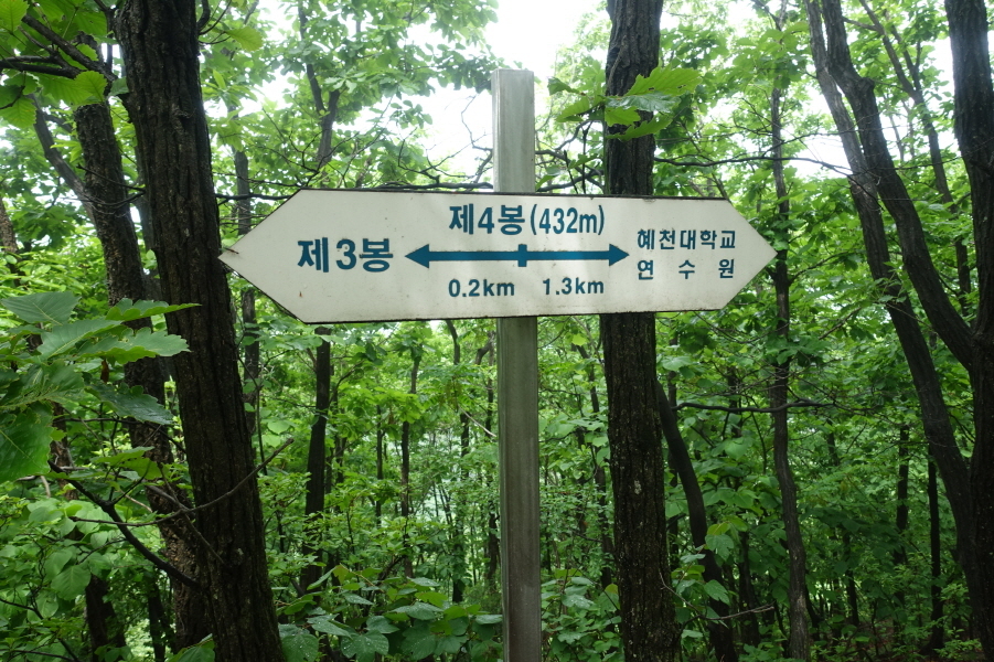 (11;10) 제4봉432m이정표(해천대학교연수원1.3km/제2봉 0.2km)입니다.