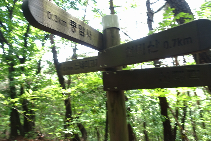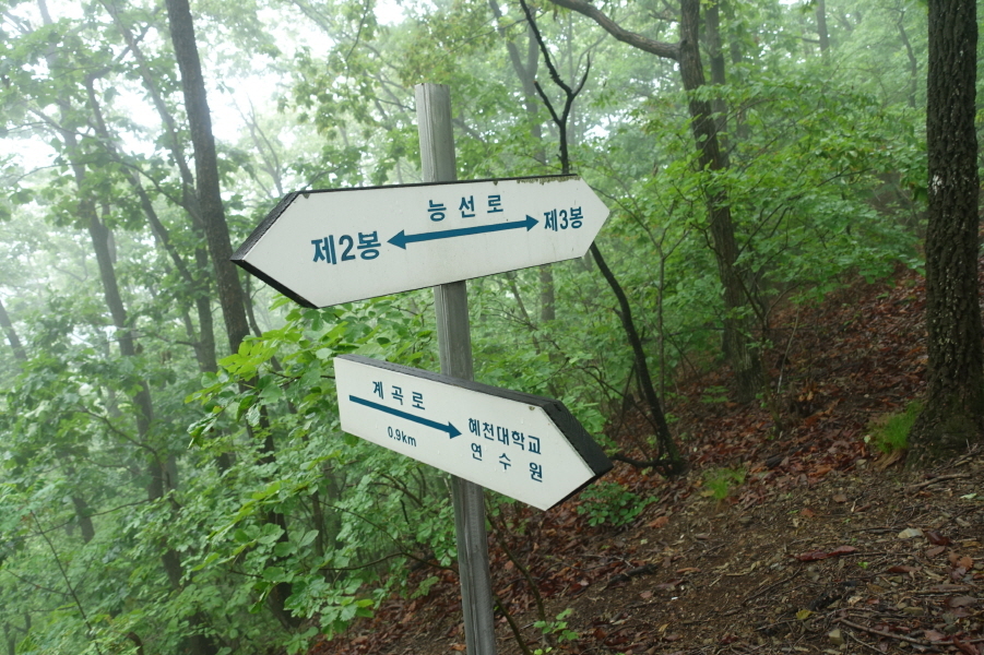 (10;55) 이정표(능선로 제3봉-제2봉/계곡로 0.9km 혜천대학교연수원)입니다.