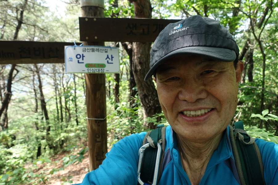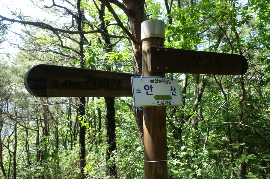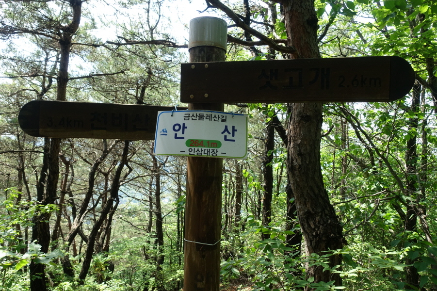 이정표(샛고개 2.6km /천비산 3.4km) 겸 정상묘지목에 인삼대장님이 부착한 안산 정상표지판 걸려있다. 이정표 기둥에 안산 260m라고 정상임을 알리는 글씨가 새겨져 있다.