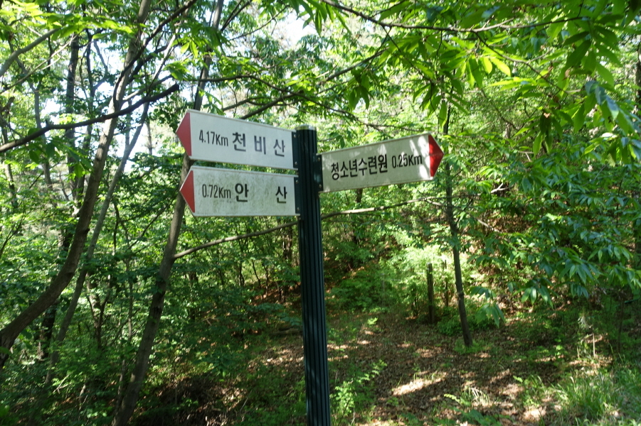 안산을 지나 완만한 내리막길을 계속 간다. (14;51) 이정표(청소년수련원0.90km/안산0.07km/천비산3.52km) (14;57) 이정표(청소년수련원0.56km/안산0.41km/천비산3.86km)이정표가 있는 삼거리가 나오는데 청소년수련원 0.56km가 가리키는 왼쪽길로 간다. 오른쪽 방향으로는 아무 표지가 없는 길도 있는데 아마도 청소년 수련원향 일듯 싶다. (15;05) 이정표(청소년수련원0.25km/안산0.72km/천비산 4.17km)에서 이정표 청소년 수련원 방향으로 간다. (05;07)이정표(생활관/스카이점프/정상)에서 조금 내려서(15;09~15;11) 청소년수련원내 건물들을 지나 정문을 나간다. 유동천을 구경하면서 (15;15)수련교를 건넌다.[1.5km][35분]
