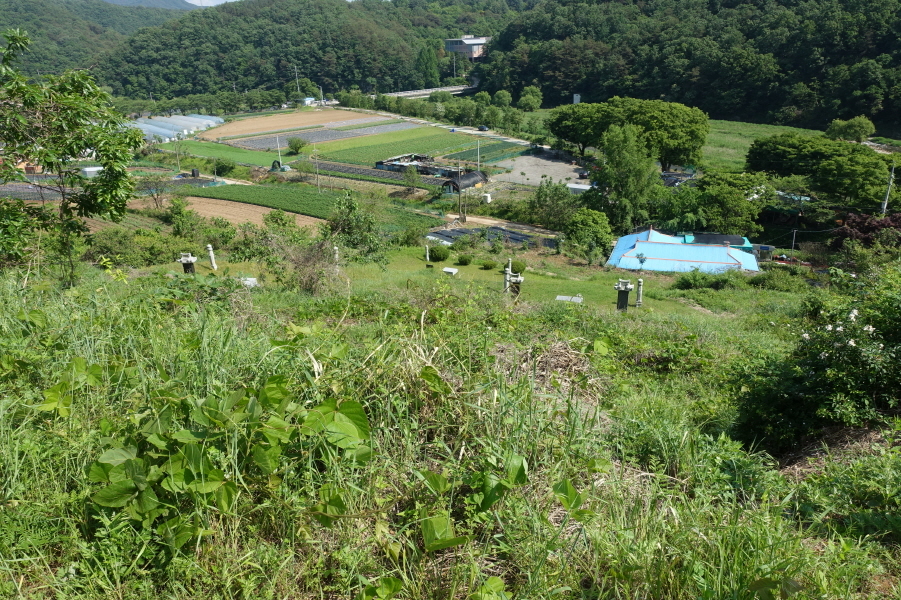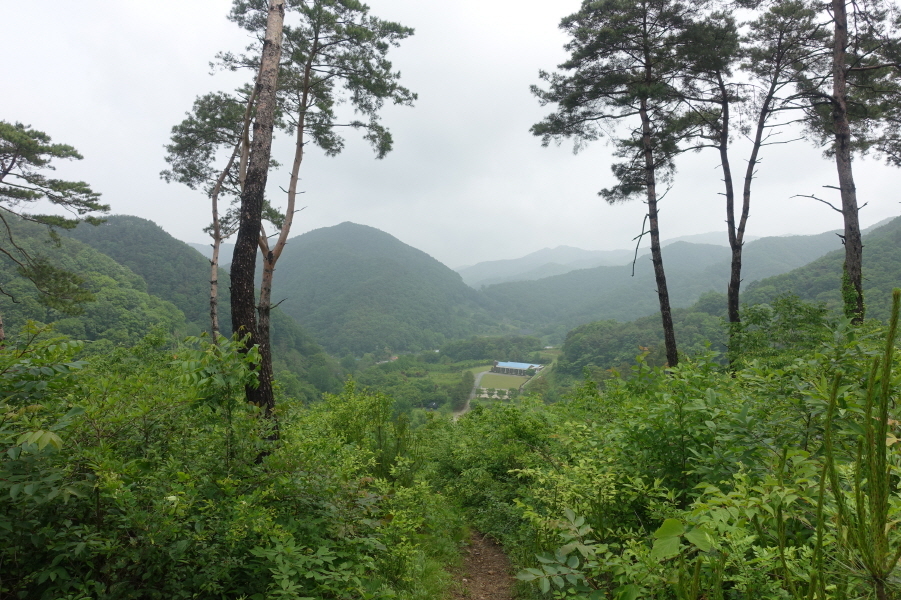 15;25 묘지군 중간지점에서 청소년수련원 건물. 수련교. 도로. 그리고 올라온 묘지군 길을 내려다 봅니다.