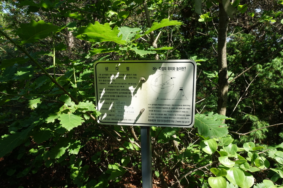 (14;40)정상 이정표로 돌아와 북쪽편으로 가니 삼각점(대전463/판독어려움)과 삼각점 설명판도 만난다.