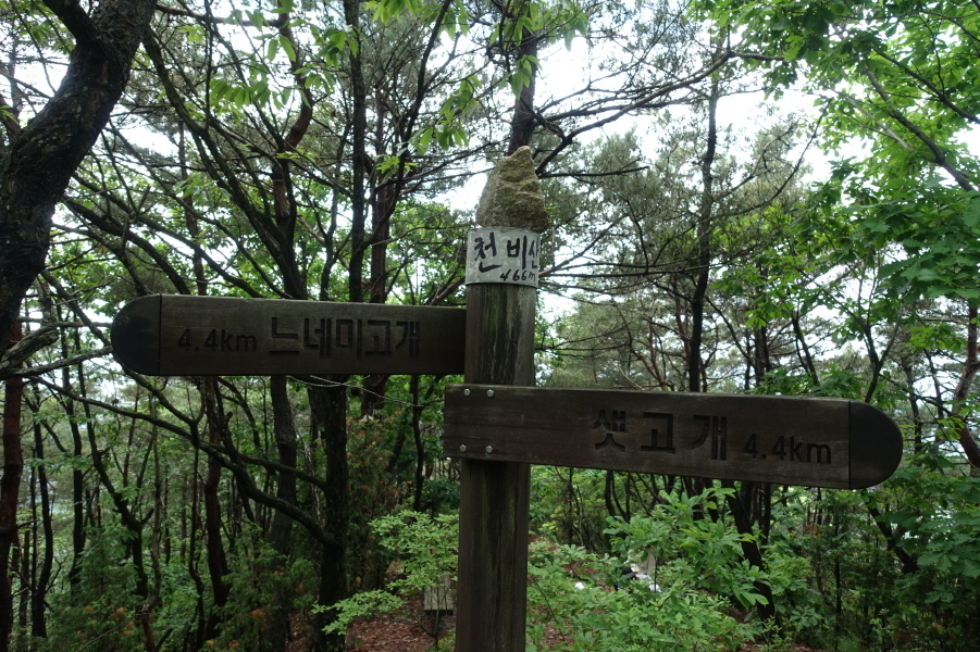12;45~12;50[5분]이정표(샛고개4.4km/느네미고개4.4km) 표지목에 천비산 매직으로 쓰여있습니다.
