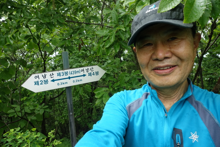 (11;00~11;03)[3분]어남산 정상 제3봉439m 이정표(제4봉0.2km/제2봉0.3km) 인증사진입니다.