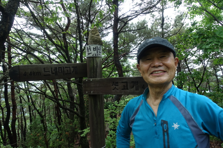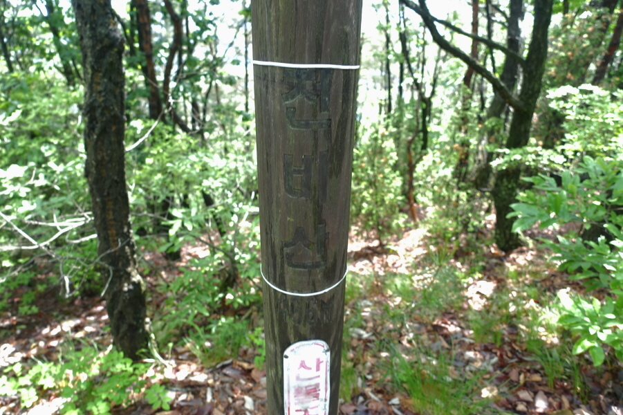(12;00~12;10) [10분]소나무숲 쉼터봉에서 커피와 간식을 약10여분 하면서 체력 보충한다. 능선은 평평해지고 좌측으로 90도 꺾이면서 평탄한 능선길이 서쪽으로 이어진다. (12;18) 무인 산불감시탑을 지나고 (12;30) 이정표(천비산 0.7km/중암사0.3km/신대리/느네미고개 3.7km)와 이정표(신대리/등산로)가 있는 중암사/신대리 사거리를 지나는데 좌측은 신대리, 우측은 중암사, 천비산 정상은 계속 능선을 따라 직진한다. 중암사 사거리를 지나고 완만하게 올라가면 천비산 정상이다.[2.3km][102분]