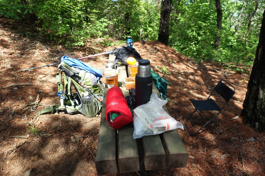 (13;55~14;40)[45분]간 정상 직전 벤치를 식탁삼아 산상 만찬(?) 시간을 갖습니다. 친구 정화가 준비해 온 뜨거운 물 부어 컵라면 누룽지탕 만들어 두고 미나리 홍어무침 안주에 시원한 막걸리 건배 합니다. 과일도 깎아 먹고 참으로 오랜만에 여유롭게 식사 즐깁니다.