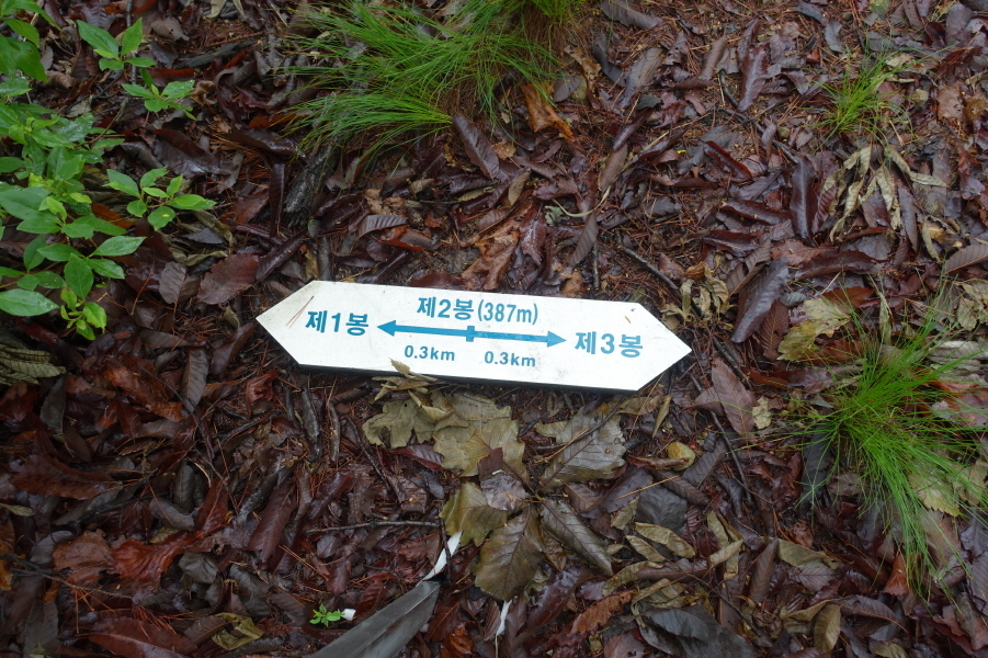 (10;54)땅에 떨어진 이정표가 있는 어남산 제2봉(387m)(제3봉0.3km/제1봉0.3km)입니다.