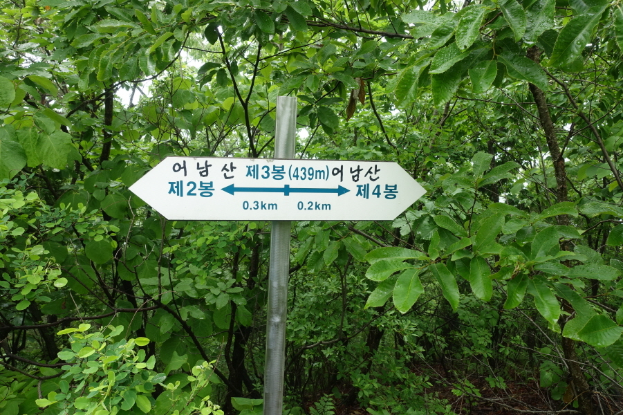 (11;00~11;03)[3분] 제3봉439m 이정표(제4봉0.2km/제2봉0.3km)판에 매직으로 어남산 표시되어 정상임을 말해줍니다
