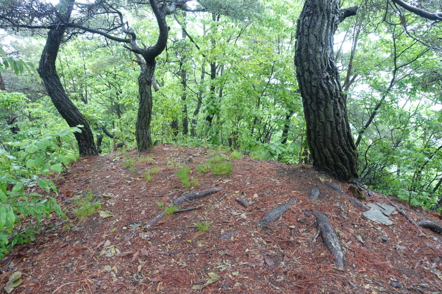 능선 직전 90도 우회전하여 우측 사면 우회길을 따라 올라 동북방향으로 이어지는 능선을 따르다가 급경사 오름길 극복하여 (10;40)소나무 1그루가 예쁘게 서있는 봉우리 올라선다. 섬바우봉이다.[1.5km][45분]
