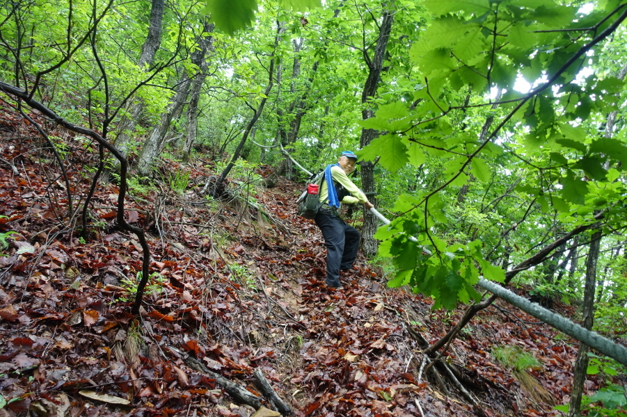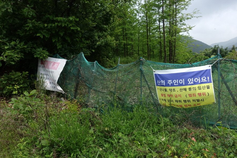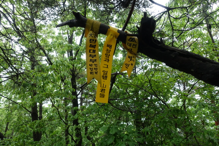 "산의 주인이 있어요"현수막 걸린 울타리를 우측에 끼고 고개를 지나 다시 가파른 오르막길이다. 붙잡을 나무도 마땅치 않은 엄청 경사가 급한 급경사 길을 올라간다.