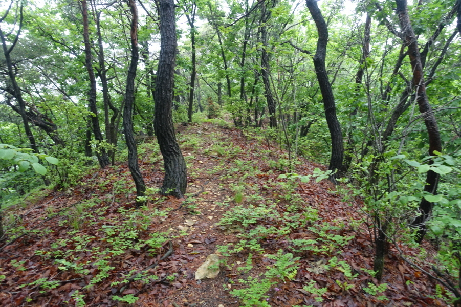 어남동 버스종점에서 아스팔트 도로따라 약150미터를 올라가면 느네미고개다. (10;00)우측으로 시멘트길을 따라 들어가면서 본격적인 산행이 시작된다. (10;00~10;15)[15분] 시멘트 길이 끝나는 곳에서 과일도 깎아먹고 약15분간 산행준비한다. (10;15) 세우비에 젖은 비포장 임도길을 따라 오르다가 고개마루 직전에 우측으로 산길이 열린다. 완만한 오름길 뒤 가파른 오르막을 오른다.