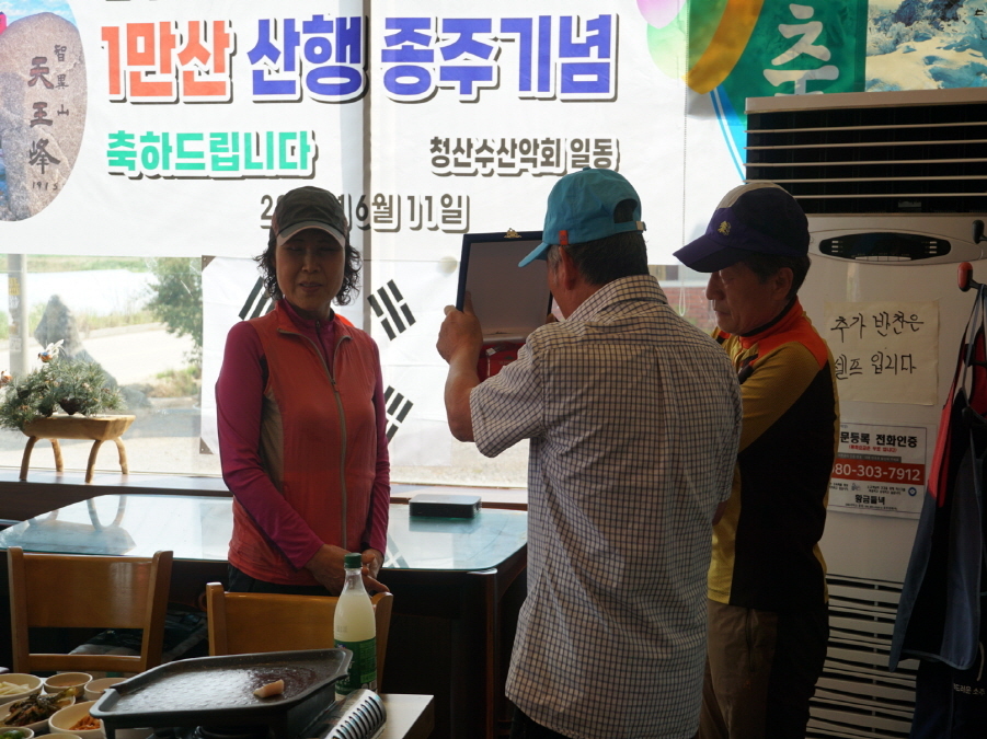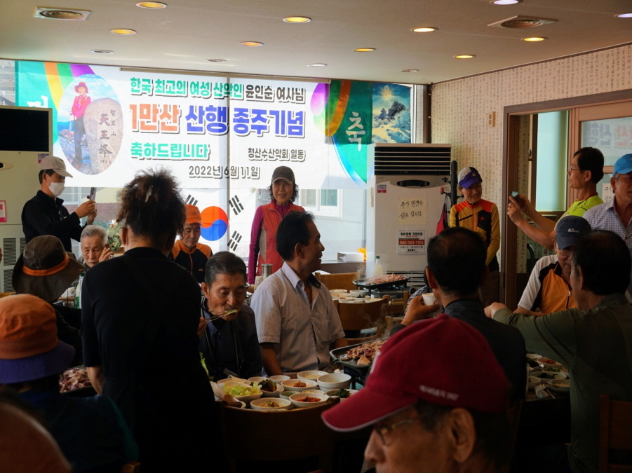 완주한 두 대원(문일님과 조락주채약산님) 도착한 (14;50)경 소라실 마을 출발 (15;05)행사장인 황금들녁 식당에 도착 윤인순 여사님의 10,000산봉을 등정한 기념행사를 약 15분(14;50~16;10)하고 오리로스구이 된장찌개 백반에 막걸리 건배하고 전체 사진도 촬영 합니다. 아침에는 시루떡, 기념타올을 제공하고, 점심식사 까지도 개인 자비로 부담한 윤인순 여사님께 감사드립니다. 그리고 10,000산봉 등정을 축하 드립니다.