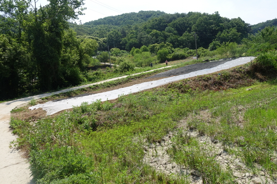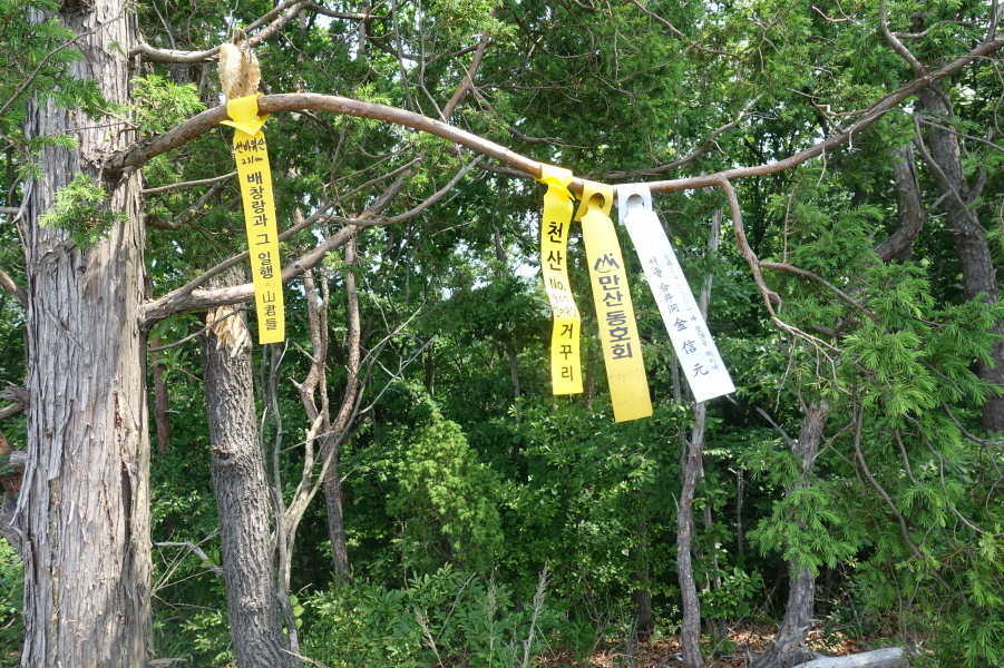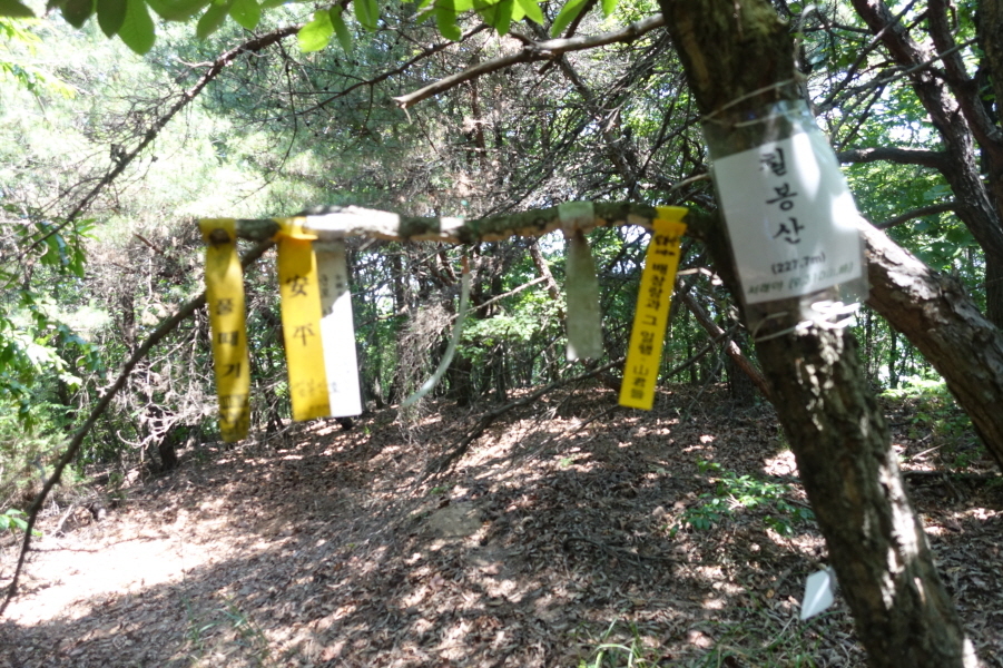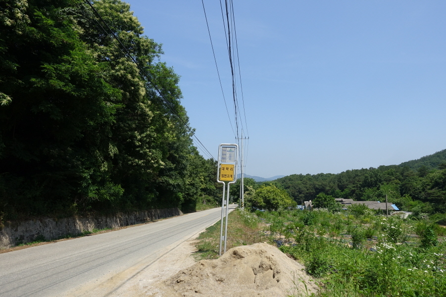 산행종료 시간 (14;30)까지 약1시간 7분 남았습니다. 접지른 발목의 통증도 심하고 어차피 산악회에서 잡은 산중 평안산(平安山162m).삼태봉(134m).장군봉(將軍峰 110m128m)을 다 소화하지를 못할 시간이기에 한번 더와서 못다한 평안산(平安山162m).삼태봉(134m).장군봉(將軍峰 110m128m)에 매봉(183m).달산봉(234m).신기산(276m)를 엮어 개인적으로 진행하기로 하고 도로따라 산행날머리로 향한다. (13;24) 국동리 버스정류장에서 물 한모금하고 평안산과 삼태봉을 일별하면서 (13;26) 땅 사실분 플랭카드를 지나고 (13;42) 산악회버스가 기다리는 소라실 입구 정자에 도착 산행종료한다.[1.3km][22분]