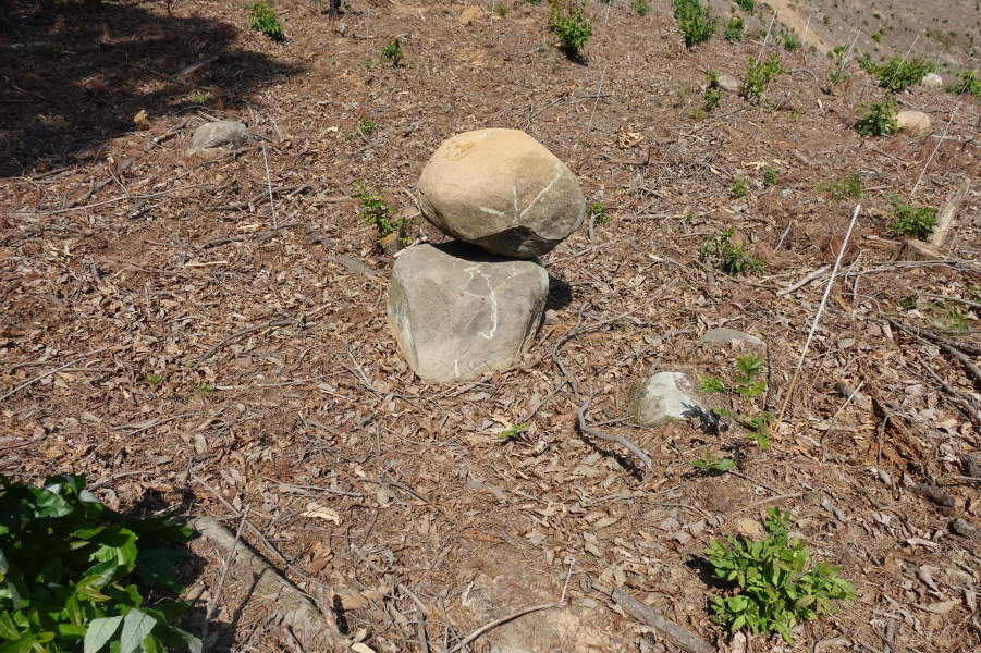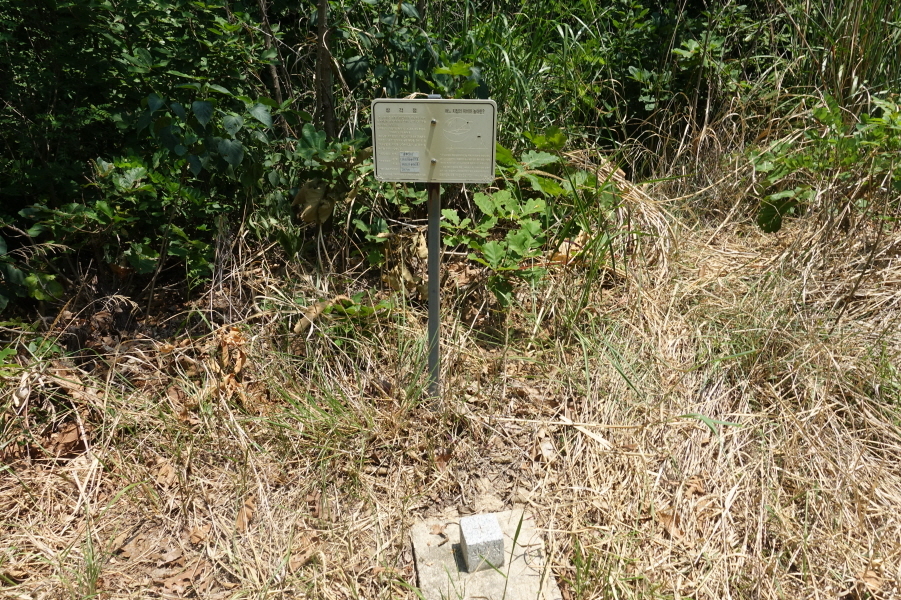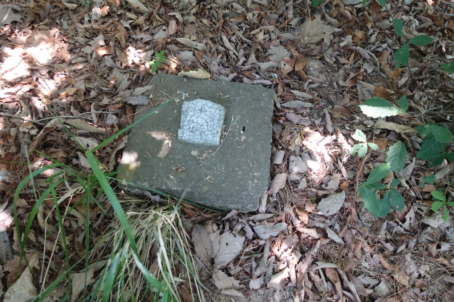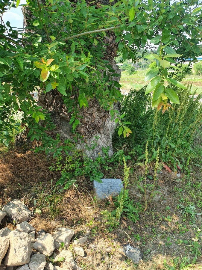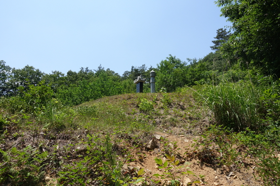 삼각점(공주310) 있고 선답자님들의 표지기 걸려있다. 표지기 옆에 표지기 걸고 인증사진 남긴후 약10분간 물도 마시고 과일도 먹으면서 방전된 체력을 보충한다. 부드러운 능선길 내려서다가 오두재에서 올라오는 마의 능선 가기 전에 우측으로 희미한 등로 발견 등로 따라 내려선다. 등로는 임도로 변하고 임도에는 소나무가 자라 간신히 빠져나간다. 3거리에서 우측길이 좋아보여 임도 따랐으나 임도는 끝나고 뚫을수없는 잡목구간이라 임도 3거리로 Back 직진 길을 내려서니 나름 등로가 열린다. (12;58)석물을 갖춘 진주 강씨와 그부인 합장 묘지 오르는 좋은 길 만나 편안하게 내려서 (13;07)농로따르고 (13;14)견동산골 마을 버스정류장(210.212번)을 지나 민가에서 물 보충하고 (13;23)국동리 마을표지석 서있는 평안산 왕복 3거리다.[2.3km][48분]