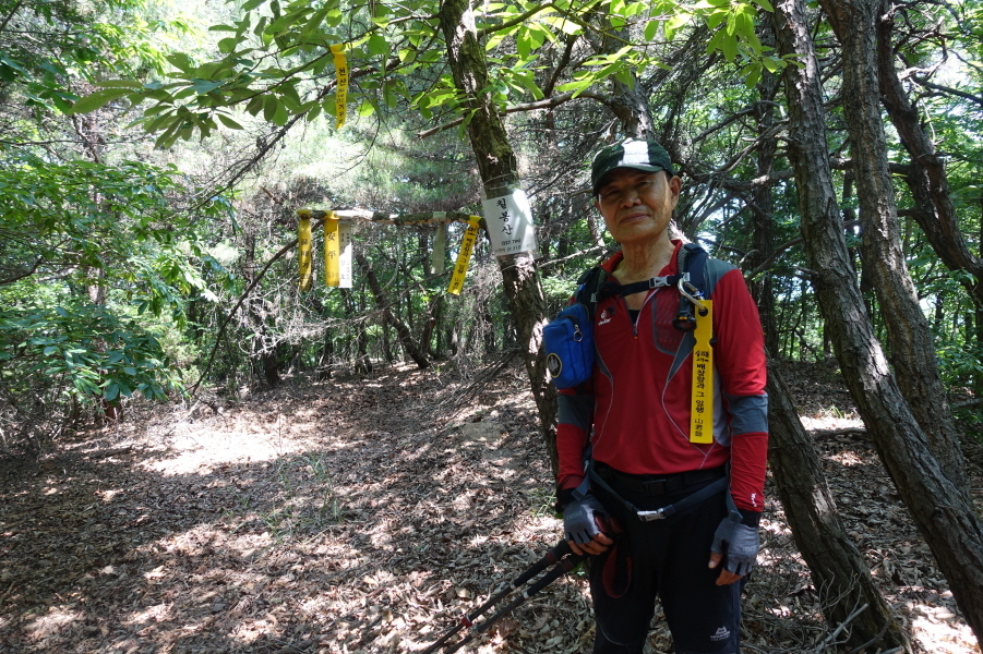 선답자님들의 표지기 많이 걸려있고 서래야 박건석님의 장구봉 표지판도 걸려있다. 인증사진 남기고 우측으로 반원 형태 능선길 치고 내려선다. 임도길 만나 임도 따라 진행 (10;51) 아스팔트도로상 대학리 임천고개 버스정류장을 지난다. 우측능선을 오르는 등로 따라 급경사길 치고 올라 옥녀봉 능선에 붙어 좌측으로 진행 좁은 등로 숲길로 들어서 오름길 오르니 (11;12)옥녀봉 정상이다.[1.4km][33분]
