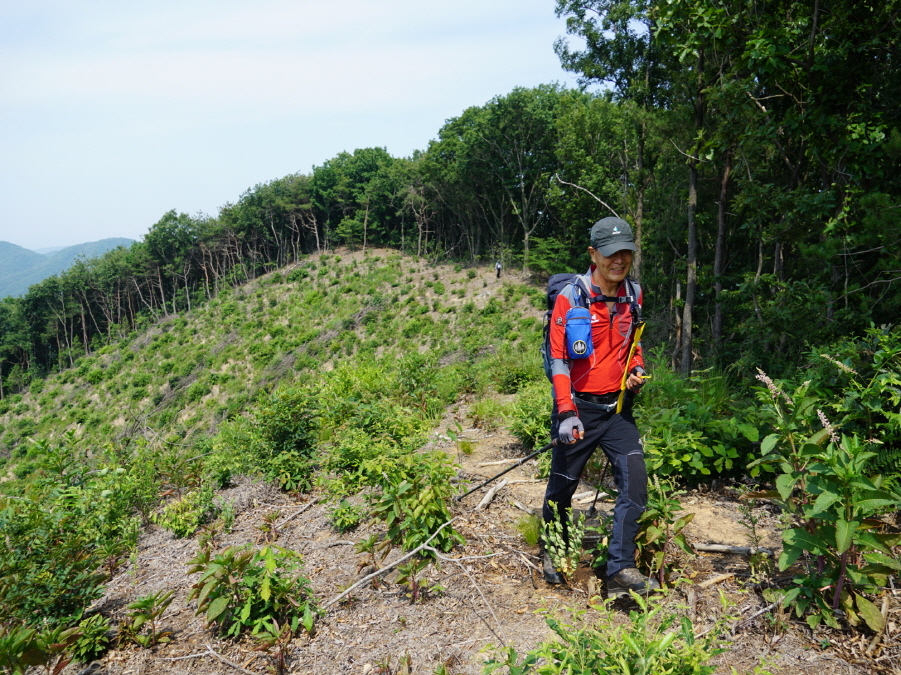 임도가 끝날 즈음 우측 능선을 향해 개척으로 치고 오른다. 급경사 오름길이다. 나무를 붙잡고 미끄러지지 않으려고 발버둥치면서 오른다. 전위봉에 오르니 능선은 부드러워 지고 완만하게 오른다. 표지기 2장이 걸린 봉을 지나니 우측으로 벌목개활지다. 모처럼 조망이 터진다. 능선길 이어가 오르니 특별할 것도 없는 선바위산 정상이다.[1.0km][22분]