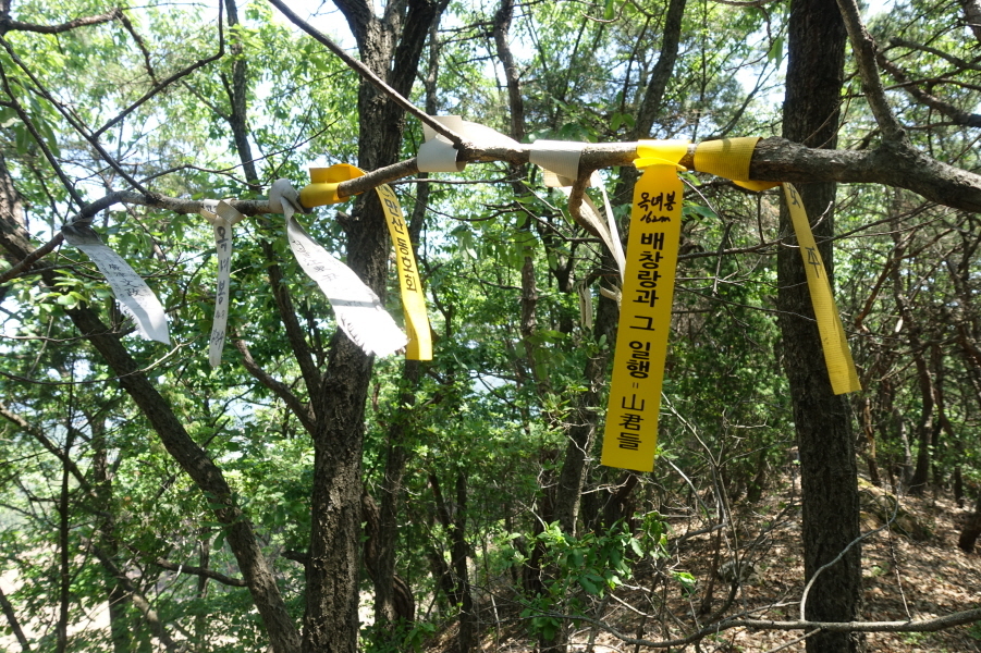 선답자님들의 표지기걸고 인증한다. 하산은 벌목지대를 급경사 길을 개척으로 치고 내려선다. (cf 임도에 내려서기전 마사토길이 미끄러운 탓 엉덩방아 찧으면서 발목이 접질러지는 가벼운 부상을 입어 걷는 것이 불편하다. 산행중 처음 겪은 일이다. 우측 다리가 허리수술 후유증으로 약해진 탓인가 싶다.)임도에 내려서 우측 묵은 임도를 치고 나가니 임도 3거리에 도착되고 임도길 따라 이곡리 효심로 3거리 출발지점으로 Back한다.[0.7km][15분]