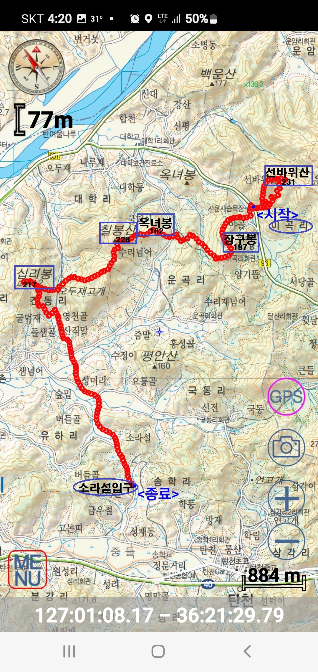 산행코스:공주이인 이곡리 효심로-선바위산(231m)왕복-장구봉(197)-옥녀봉(161)-칠봉산(228)-십리봉(217)-도로-<평안산(160)왕복)-삼태봉(134)-장군봉(128) 왕복>-소라실 마을 정자