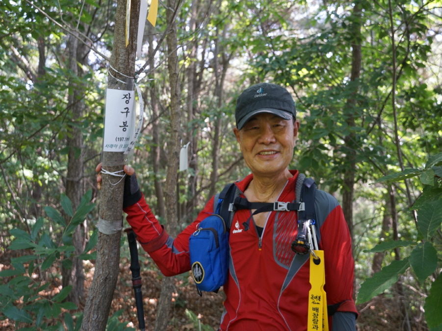 우측으로 20여m 이동 다리를 건너 임도따르다가 철망울타리 우측길로 들어선다. 묘지로 오르는 길은 묘지에서 없어지고 능선에 붙어 좋은 길 따라 능선길 이어가 오름길 오르니 장구봉이다.[1.2km][26분]