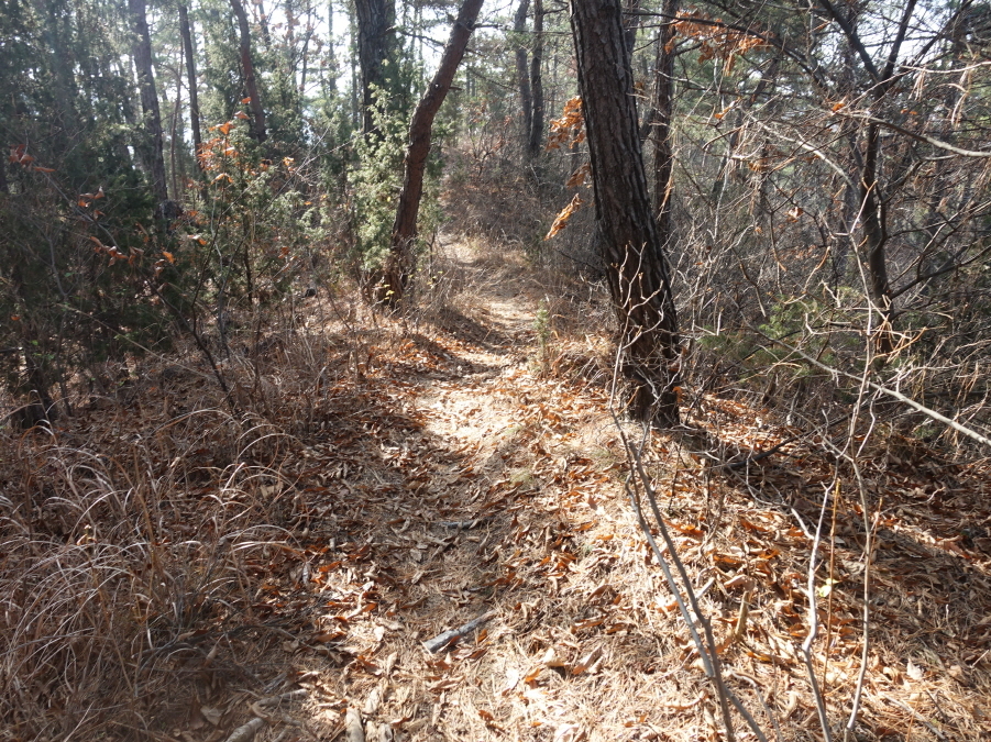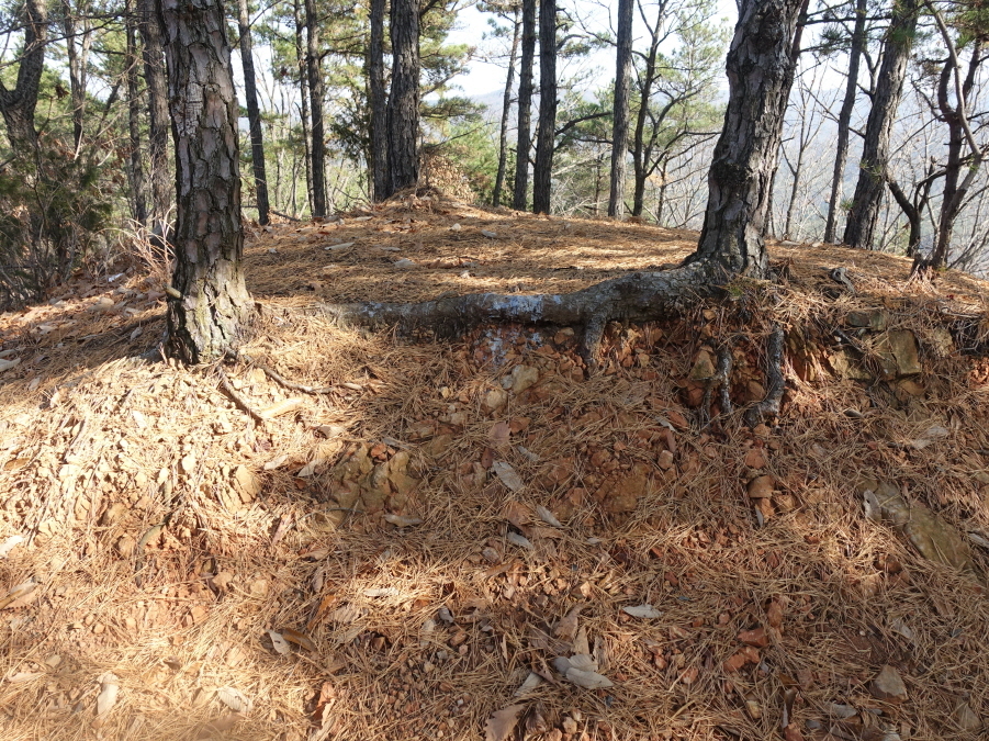 고맙다고 인사드리고 정생 3교에서 도로버리고 마을도로따라 들어가 우측으로 마을길 따라들어가니 (12;15)전원주택같은 주택2채가 나타난다. 길이 없으면 좌측 사능선을 개척으로 치려 했는데 운도 좋게 임도가 계속되어 임도 따른다. 임도는 계획한 능선에서 우측으로 조금 벗어나 진행되어 묘지에서 끝나기에 묘지로 오르지 않고 희미한 길따라 좌측능선에 들어서 완만하게 올라(12;30) 석태산 지난 201봉 직전 주능선에 연결된다.[1.2km][20분]