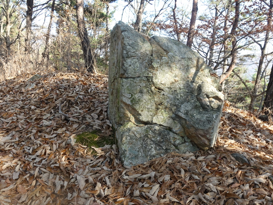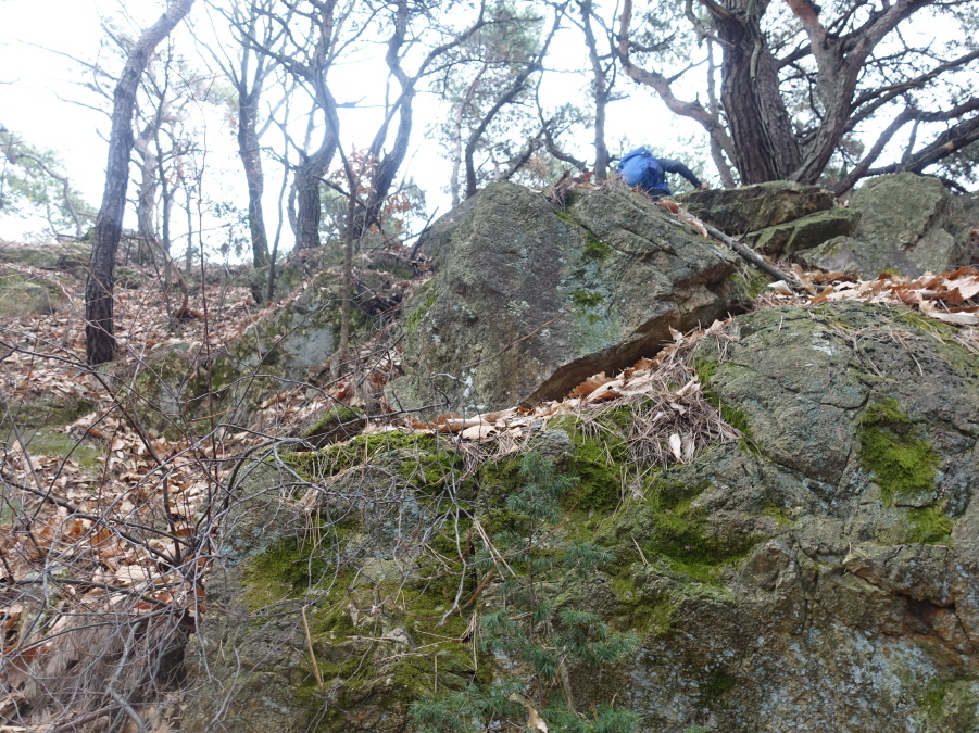 (10;49) 삼각점(대전 470)과 설명판 있는 △x387.9봉을 지난다. 다시 이정표(강바위산 0.4km /마분산 1.4km)를 만나고 오름길 올라서(10;58)강바위봉 이름을 낳게한 바위봉을 올려다본후 (11;00) 강바위산(x382봉)에 올라선다.[1.7km][39분]