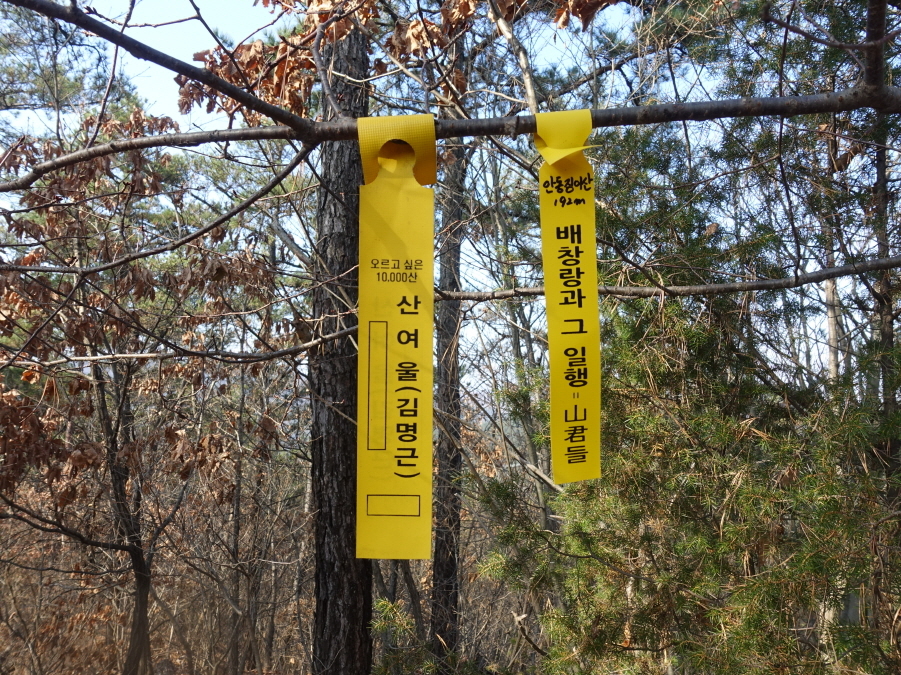 누가 어떤연유로 안동징이산이라 명명했는지 알지는 못한다. 특별한 특징이없는 정상이다. 대구 산여울(김명근)님 표지1장이 걸려있어 반갑다. 산여울(김명근)님 표지기옆에 표지기걸고 인증사진 남기고 등로에 복귀하여 처음으로 물 한모금한다. 능선길 이어가 (12;47) 한전철탑을 지나고 내림길 내려선후 다시올라 155봉에서 좌향 내림길 내려서니 (12;52)하고개 4거리안부를 지난다.