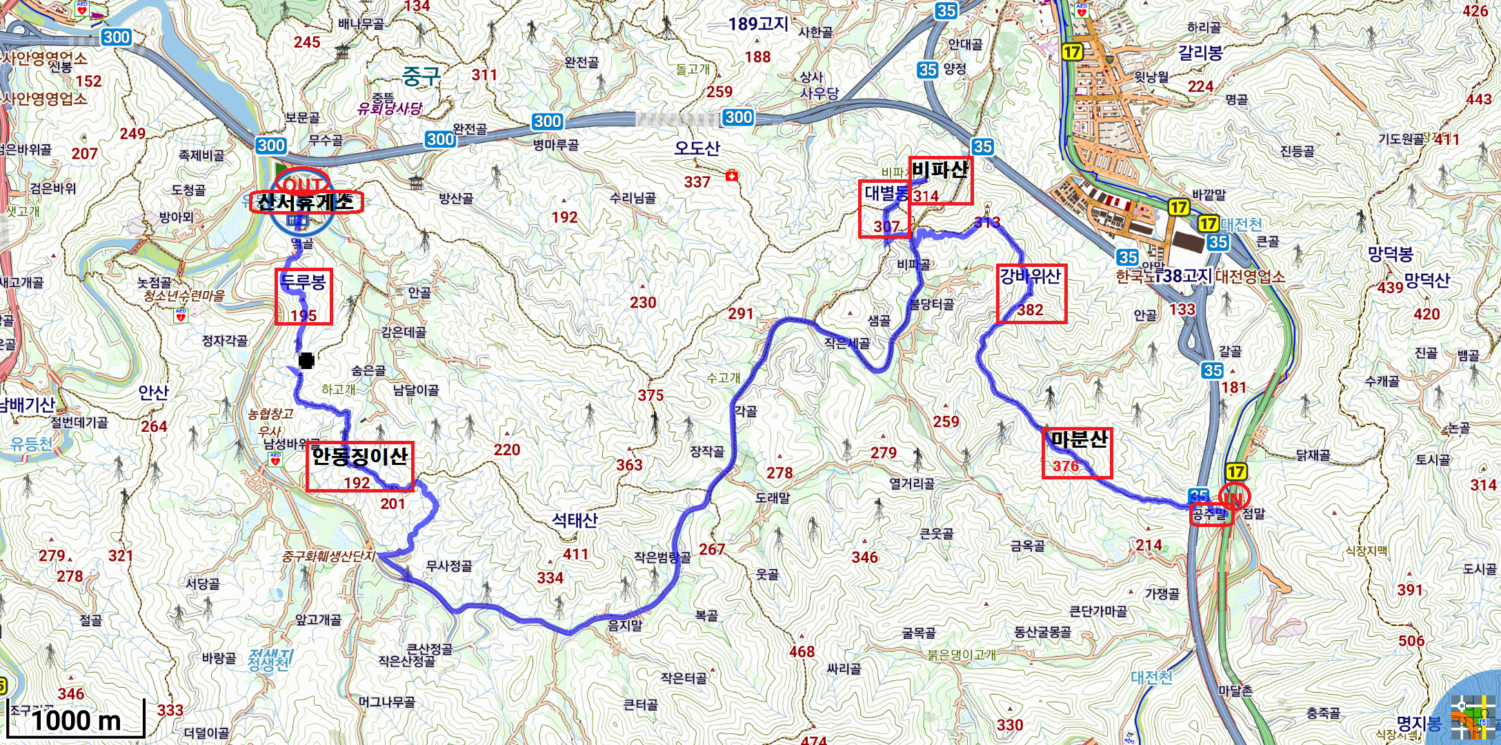 산행코스;월계교,공주마을 입구(대전 동구 삼괴동) - 삼괴동18통 마을회관(공주말경로당) - 고속도로 지하통로- 급경사 오름길-마분산(375.5) - △368.0 - 강바위산(381.6) - 비파치(지푸재) - 대별동(307)- - 비파산(314)왕복-비파치(지푸재)-도로이동 -사기점-임도-주능선 - 안동징이산(192) - 하고개 - 187.4 - 두루봉(195) - 산서 휴게소(대전 중구 목달동 455 - 1)
