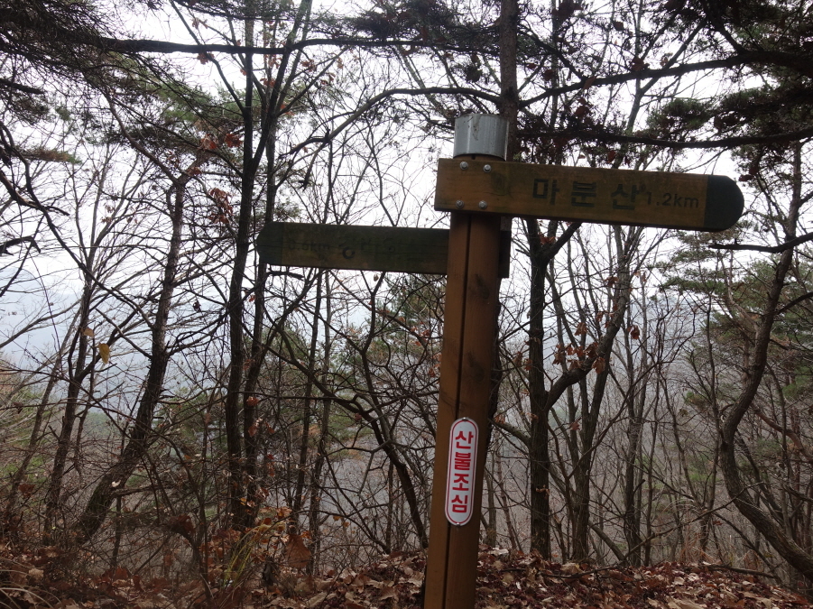 이정표(강바위산 1.8km /지프재 3.2km // 남대전물류단지 2.0km //공주말 1.3km) 서있고 , 장의자있고 무인 산불감시탑이 서있다. 작은 자연석돌에 마분산을 매직으로쓴 정상석(?)이 있다. 무인 산불감시탑 철망에 표지기 걸고 인증한후 급경사 내림길 내려선다.