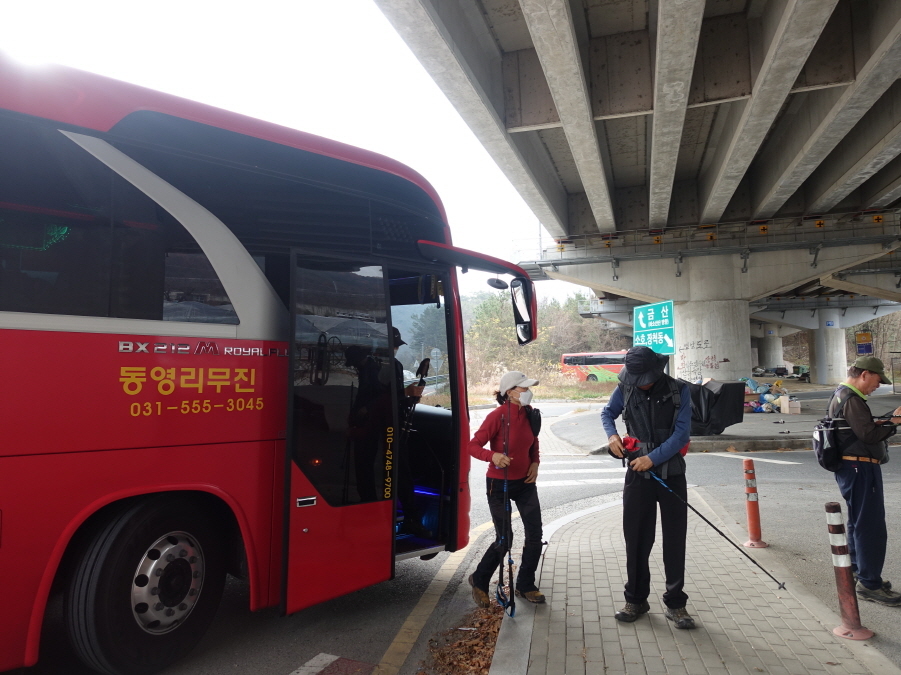 2022년11월24일(목).(06;23) 가양역에서 9호선 급행으로 (07;01) 석촌역 도착 (07;15)석촌역 5번출구 앞에서 강송산악회 리무진 버스에 탑승합니다. 차는 중간 천안3거리호수 휴게소에서 약10분간 (08;45~08;555)휴게시간 갖고 산행들머리인 (09;47) 대전 동구 삼괴동 공주말입구에 도착 (09;50) 산행시작합니다.