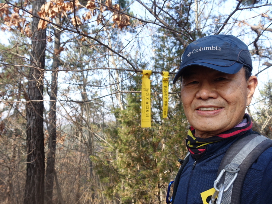 두루봉(195m)정상에도 대구 산여울(김명근)님 표지기1장이 정상임을 말해주고 있다. 산여울(김명근)님 표지기옆에 표지기걸고 인증한다. 두루봉정상에서 풀코스 완주한 준족 조종창님 만난다. 함께 좌측으로 좋은길 따라 내려서다가 우측능선임을 깨달은 조종창님 따라 우측능선에 붙어보는데 잡목의 저항이 심해 의미없는 트랙을 무시하고 두루봉 정상에서 다시 처음처럼 좌측으로 좋은 등로 따라내려서다가 우측능선으로 거의 개척수준으로 내려서 (13;33)산서로에 내려서고 우측으로 차량이 많이 다니는 길을 지나 산서휴게소 아래 공터에서 산행종료한다.[1.0km][15분]