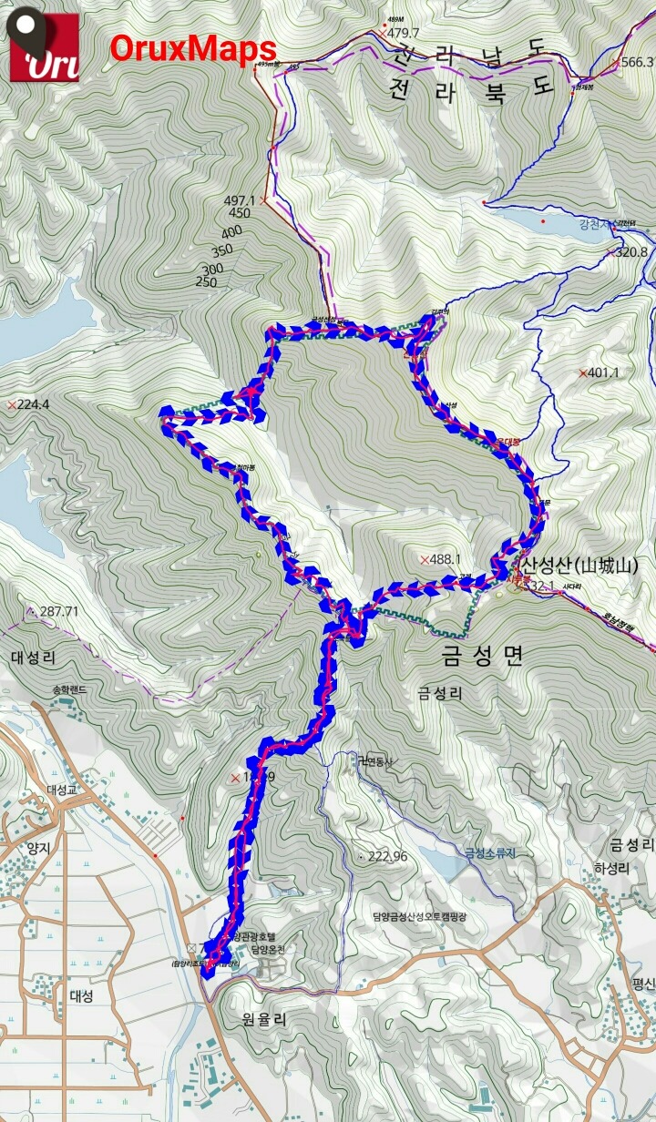 8. 산행트랙 : 담양온천→남문→금성산성→철마봉→북문→산성산→운대봉→동문→남문→담양온천