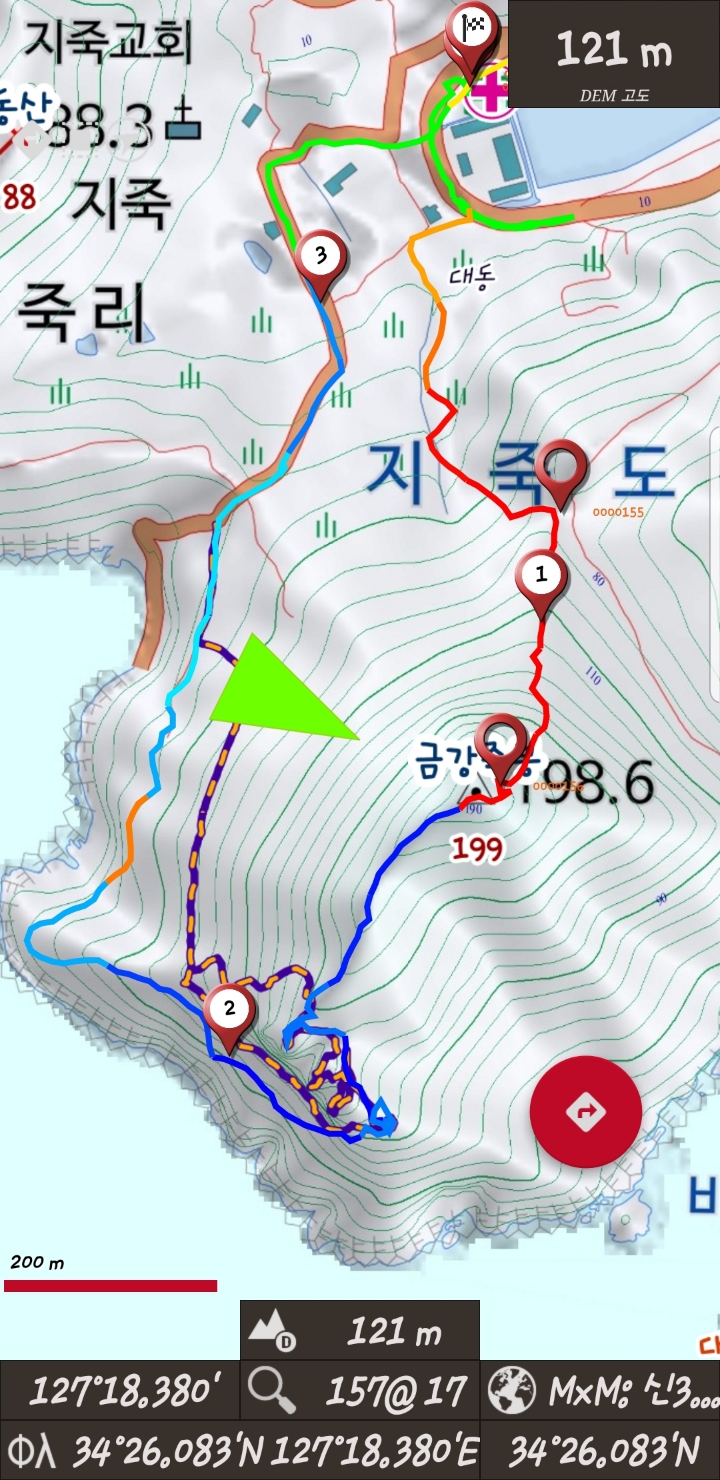 3.산행코스:♡지죽보건소-마을안길-금강죽봉-주상전리전망대-촛대바위-동백숲-지죽보건소♡
