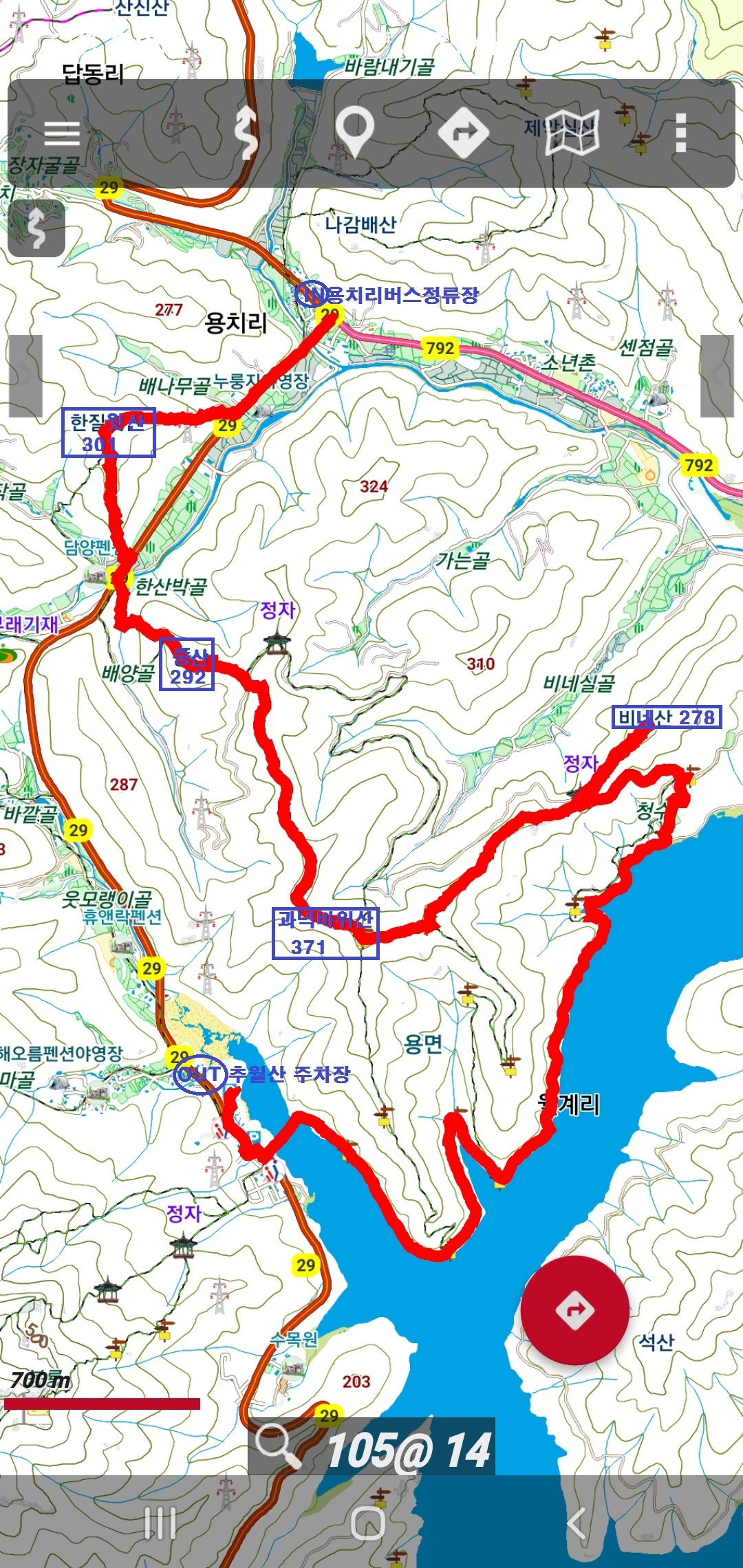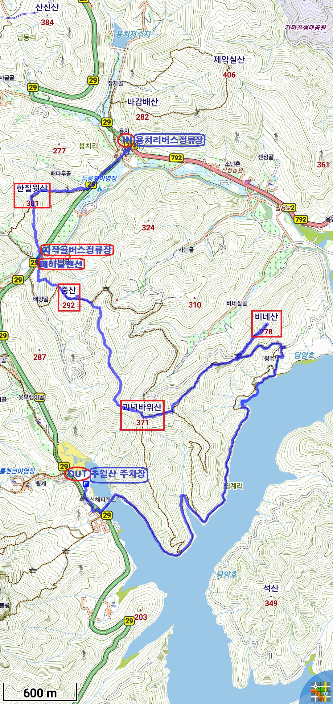 산행코스;추월산로3거리 (용치리 버스정류장)- 배남골-묘지길 입구-묘지-한전철탑-한질윗산- 배양골입구 -메이플펜션-급경사 오름길 주능선-잡목구간-중산- 잡목구간-임도-능선-과녁바위산-수행자의길-부흥정-비네산(왕복)-부흥정 삼거리-용마루길-목교-주차장