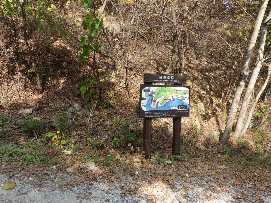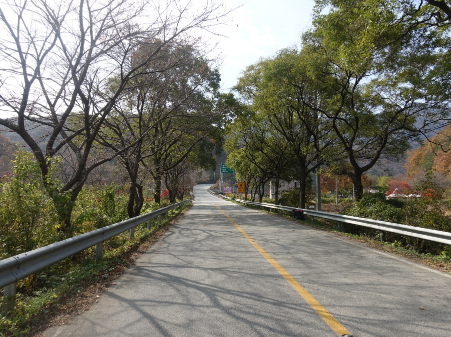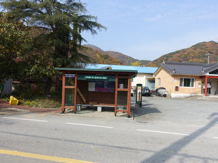 이동하는 차안에서 이인교대장님으로부터 산행지에 대한 멘트"11;10 산행시작 , 산행시간 4시간30분, 15;40 산행종료"를 듣습니다. 중간 정안 휴게소에서 휴게시산 약15분(09;00~09;15) 휴게시간 갖고, B코스들머리 가는 도중 (11;10) B코스/A코스갈림 3거리(용치리 버스정류장)에 산악회 A코스에 한질윗산(301m)를 추가 답사키로 합의한 하수성님,윤재학님과 함께 전창완총무님과 이인교대장님께 미리 부탁드리고 배려해준 덕분에 3인 먼저 내려 도로따라 용추로를 가면서 산행시작합니다.