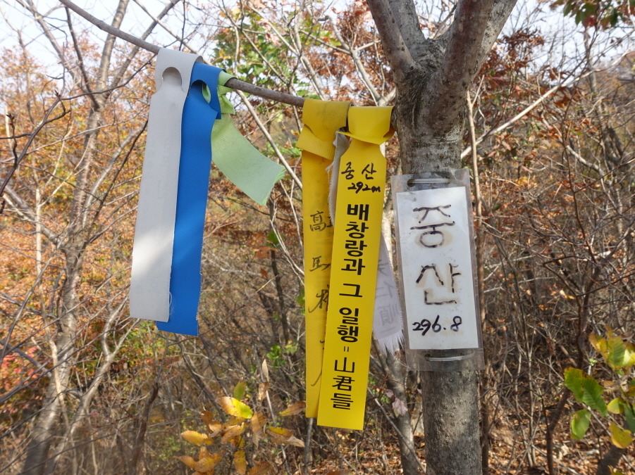 전나무 숲 급경사 길인지라 잡목의 저항이 없어 그나마 다행이다. 나무들 잡고 힘들게 능선에 붙어 올라선다 (12;04) 능선에 올라서 건너편 추월산과 호남정맥능선을 잠시 조망하고 우측으로 잡목과 가시넝쿨에 할퀴고 찢기면서 길을 치고 오른다.(12;10) 삼각점이있는 중산 정상이다.[0.5km][22분]